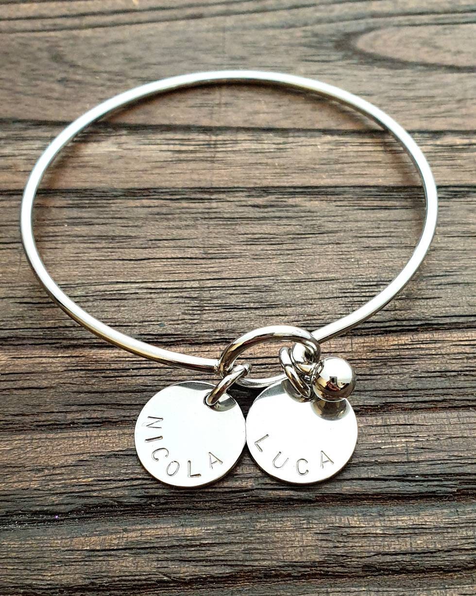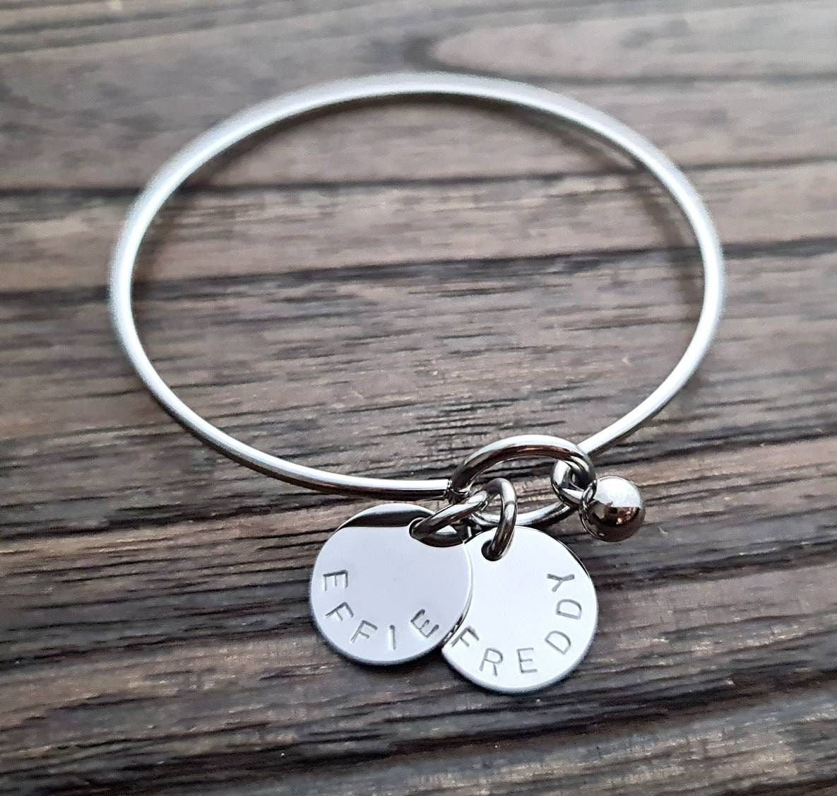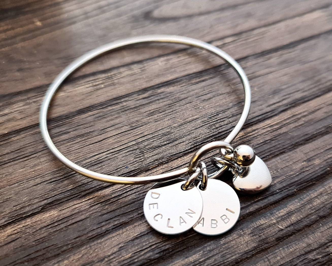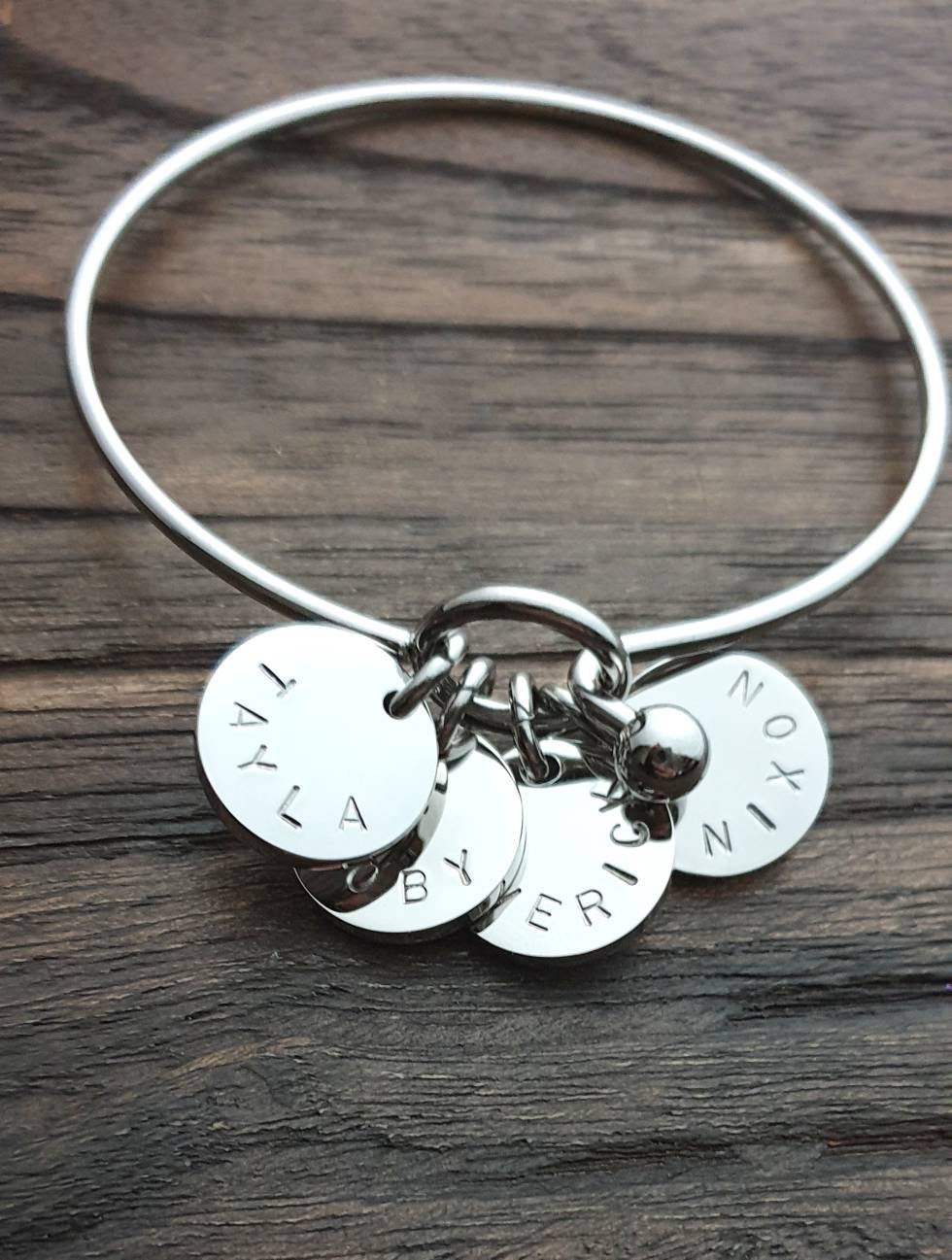 Personalised Hand Stamped Silver Bangle with Personalised Discs. Choose how many Circle Charms you need. Great Gift for Her.