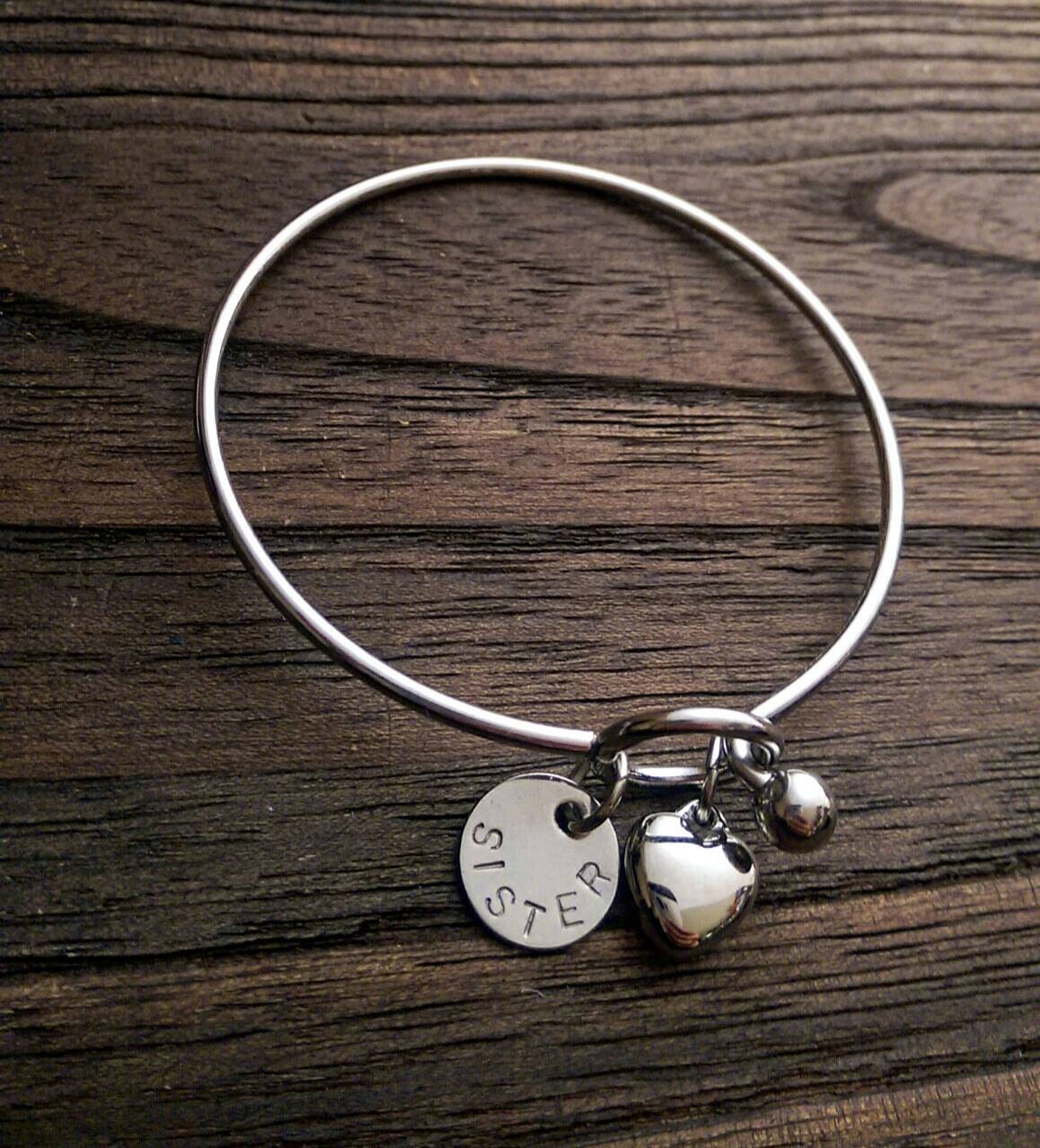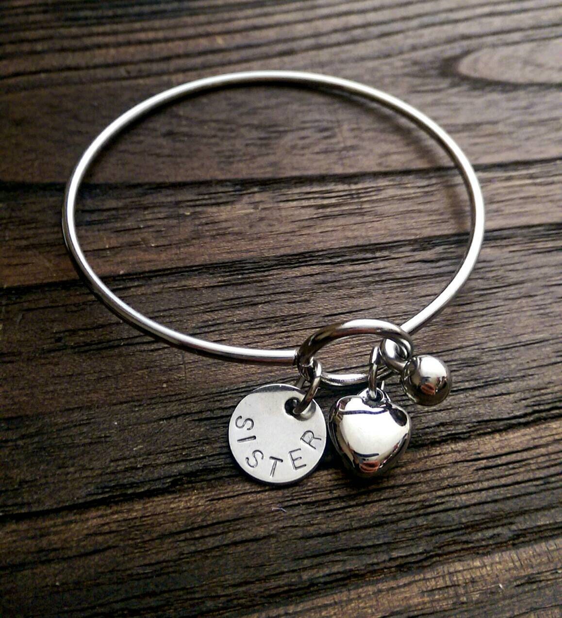 Stainless Steel Expandable Bangle with Heart Charm and personalised disc.Lovely Wedding present, Mothers Day Present, Valentines, Birthday Present keepsake.This bangle is perfect for a small wrist.This Stainless Steel expandable bangle comes with stainless steel personalised hand stamped 10mm disc charm and stainless steel puffy heart.Disc: 15mm (silver) x 2