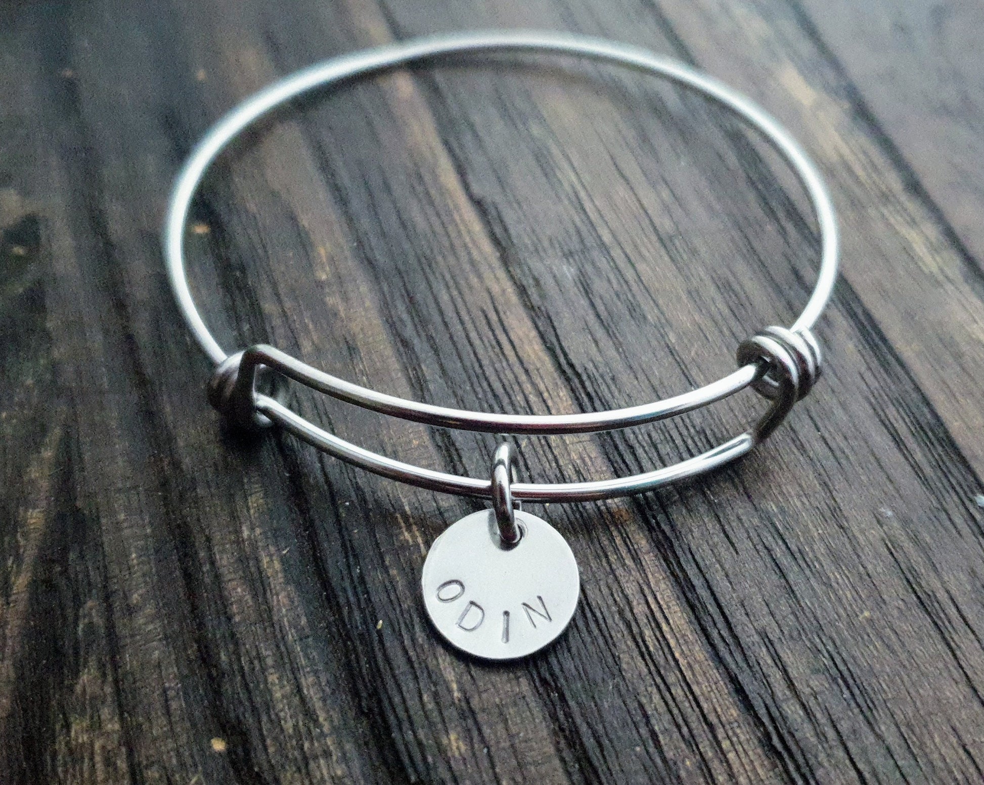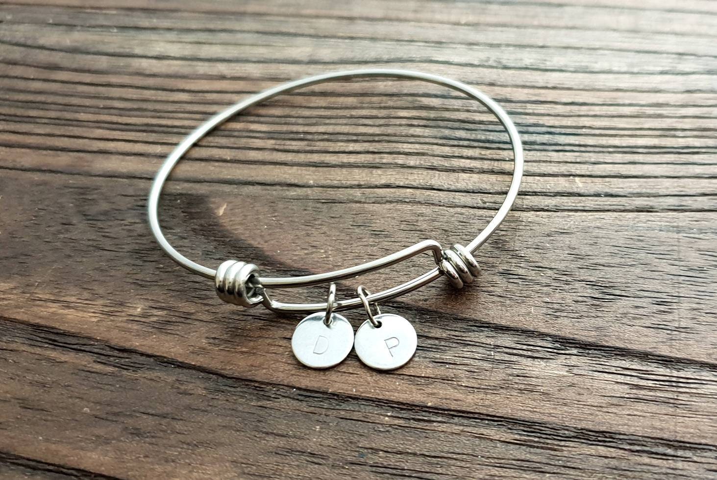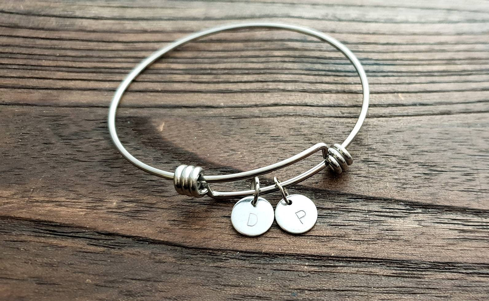 Lovely Wedding Gift, Mothers Day Gift, Valentines, Birthday Gift, keepsake.A beautiful personalised adjustable bangle that can be worn on its own or mixed together. The Personalised Bangle is created using high quality jewellery grade stainless steel, making it hypoallergenic and suitable for all skin types, to give you the peace of mind you deserve.Available in three finishes; Silver, Gold & Rose Gold This listing is for the silver, look in my store for more designs and colours.Disc size: 12mm 1mm thick You can choose 1, 2, or 3 discs if you need more let me know.Double sided disc: 15mm 2mm thick can be stamped on both sides. Please be aware that there are limits as to what I can hand stamp. As soon as your payment clears and I have your email message of what you want stamped, your item will be made and posted out between 3 - 5 days, will email you straight away if there is any delay.If you would like it blank as picture and not hand stamped, please email me a I will place a new listing for you.If you have any questions please do not hesitate to contact me.