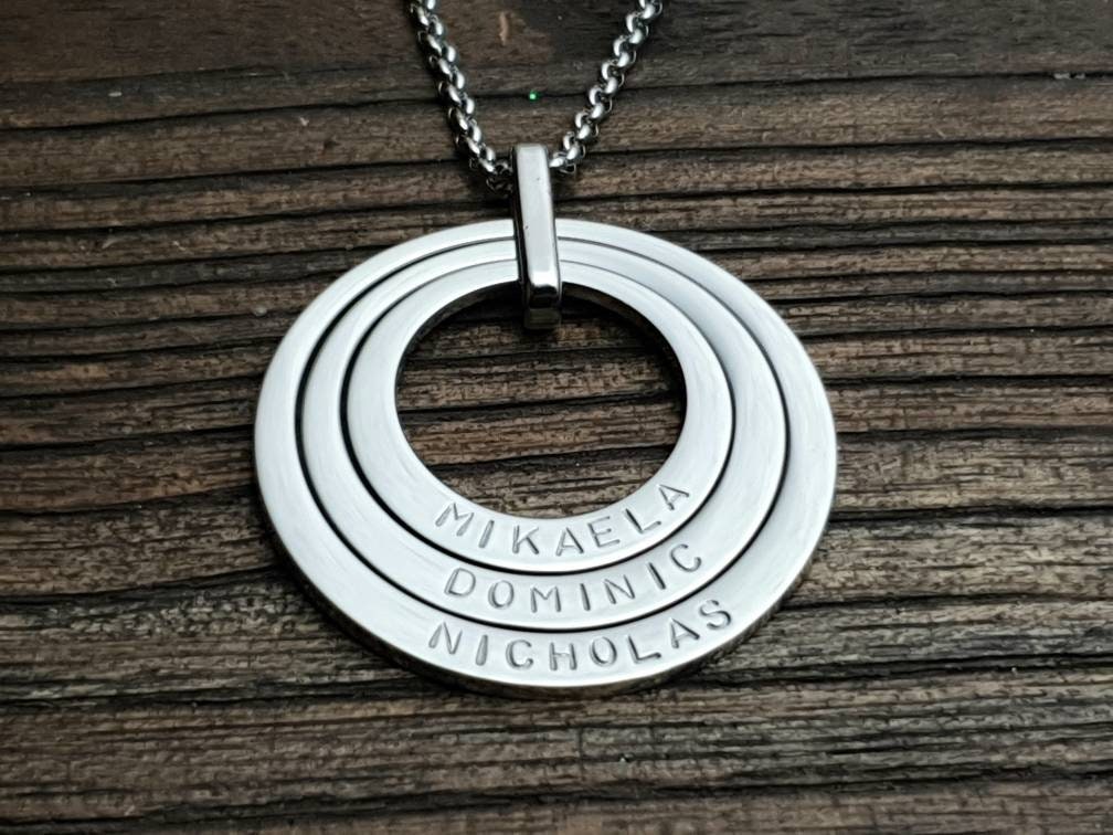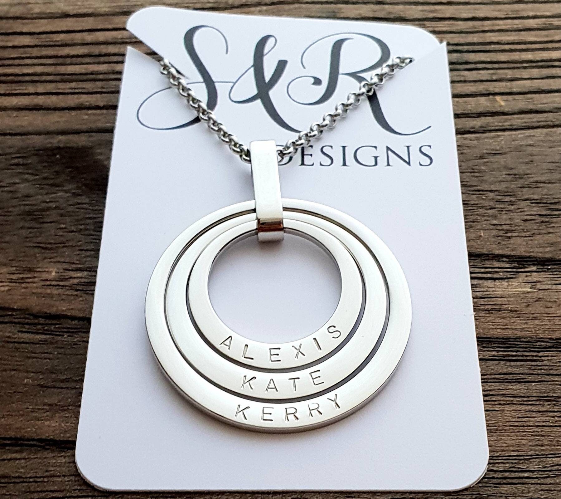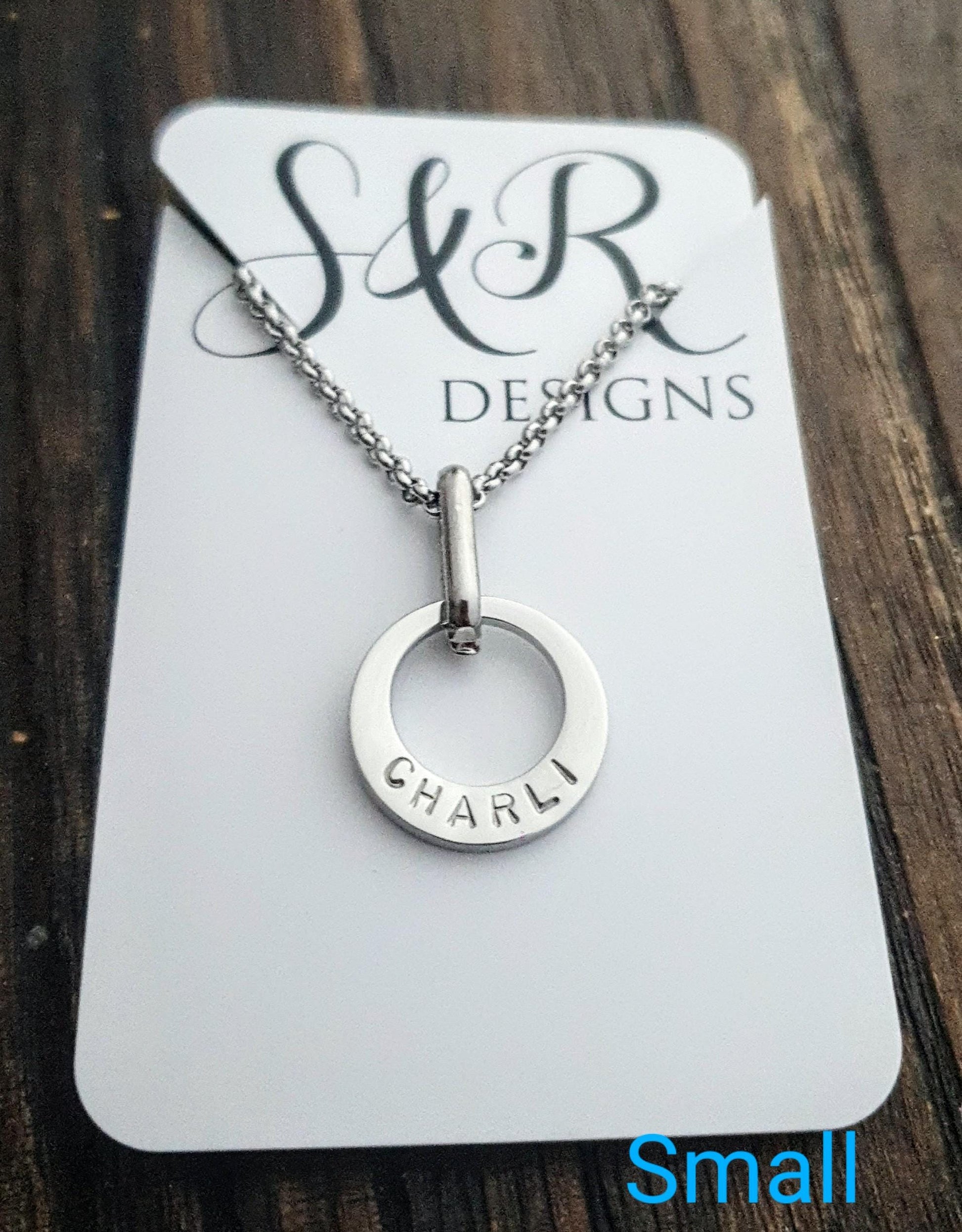 Hand stamped personalised 1 or up to 4 offset circle washers with names, dates or inspiring words.Made with stainless Steel pendant and chain.Hand stamping can be blackened as picture to stand out or left natural.Choose Chain length 45cm 18" - 60cm. I can make the chain any size you need.Washer offset circle pendant size: 2mm thick Small: 19mm