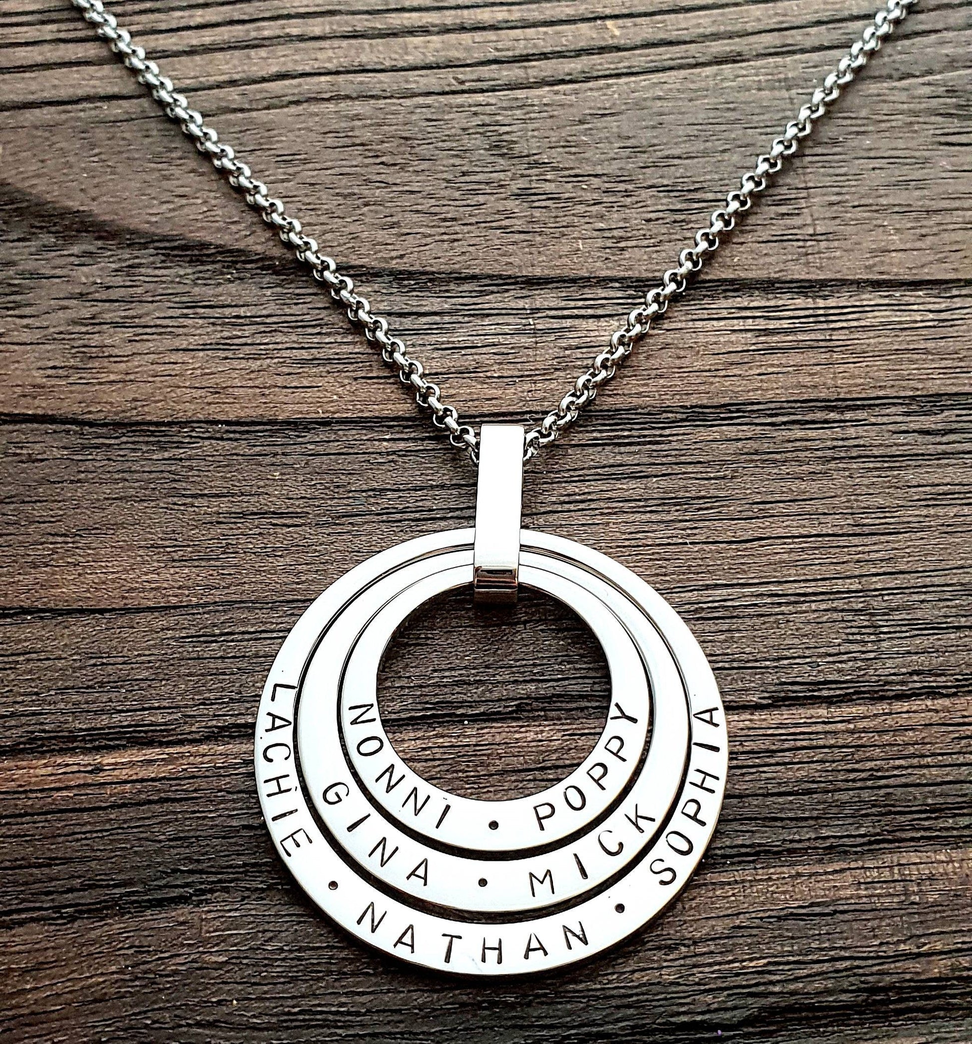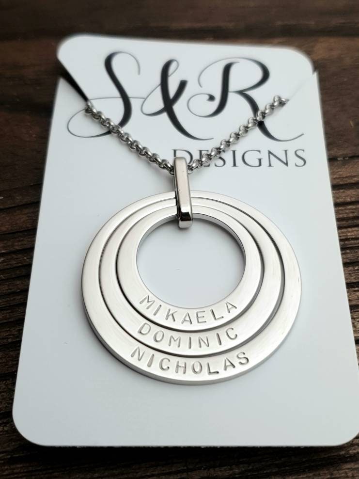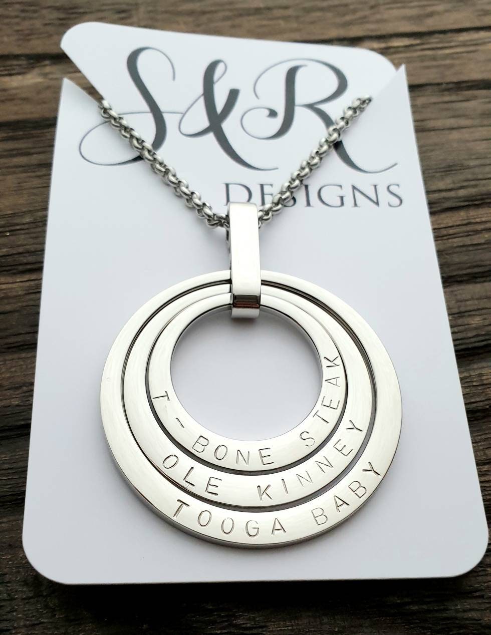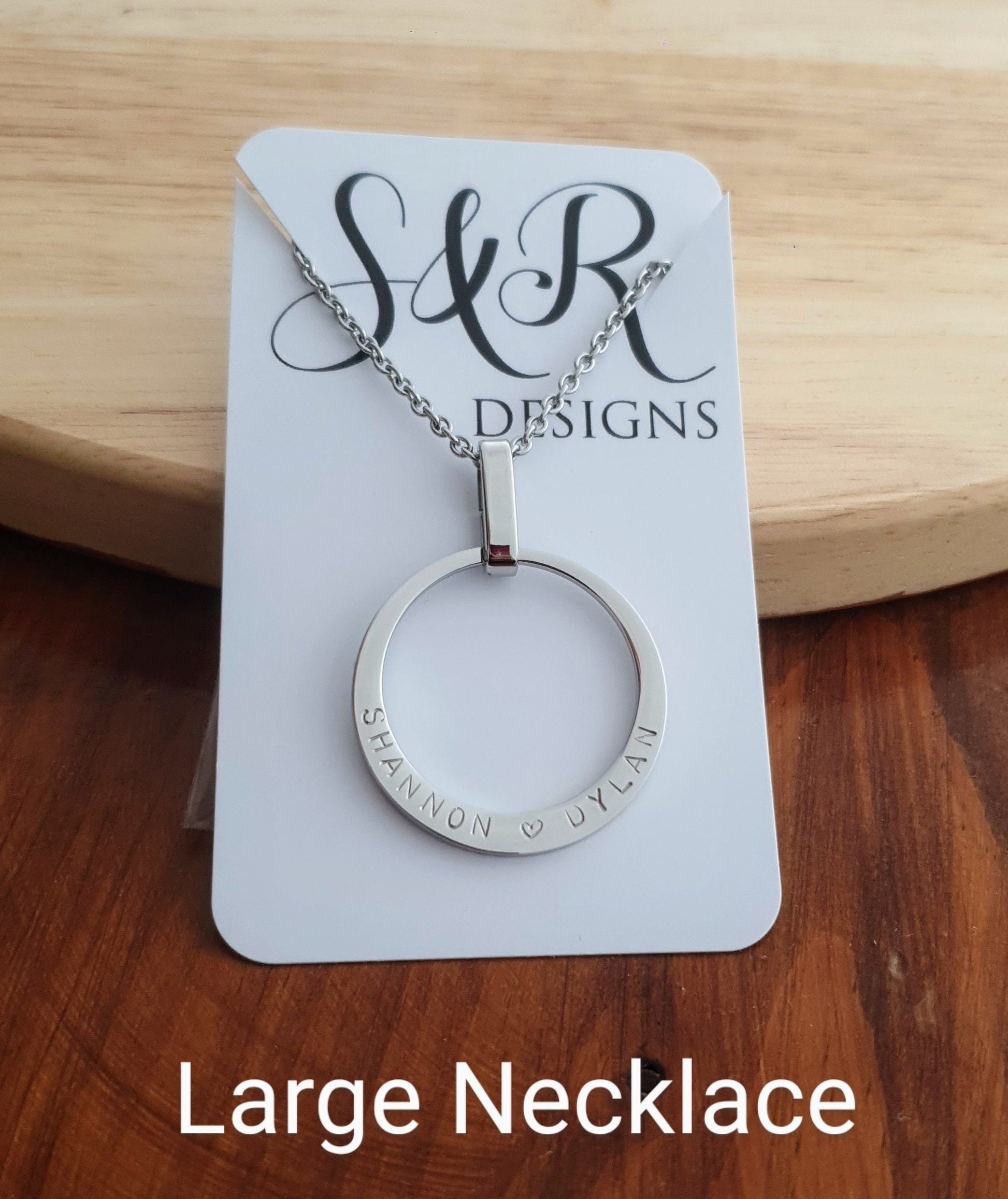 Hand stamped personalised 1 or up to 4 offset circle washers with names, dates or inspiring words.Made with stainless Steel pendant and chain.Hand stamping can be blackened as picture to stand out or left natural.Choose Chain length 45cm 18" - 60cm. I can make the chain any size you need.Washer offset circle pendant size: 2mm thick Small: 19mm