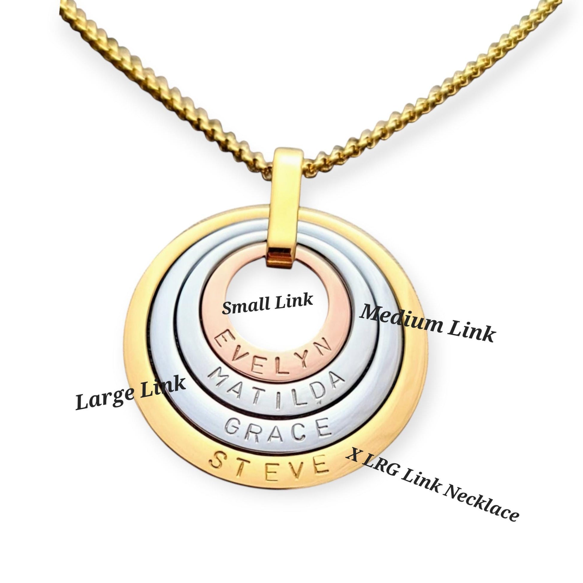 Medium: 25mm Latge: 32mm X Large 38mmYou can choose just one link or a couple or all 4 depending what you need. Mix colours or just solid colour all the way through. Once you have purchased your necklace and have given me the names or words, I will do a sample for you. Then if you are happy with the sample I can go ahead and make your necklace for you.If you have any questions please feel free to contact me.