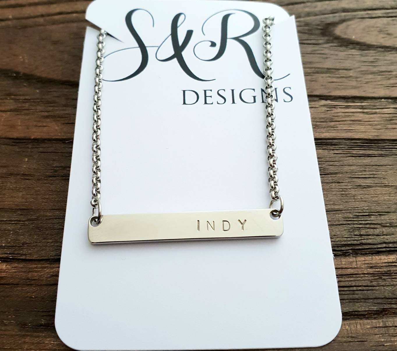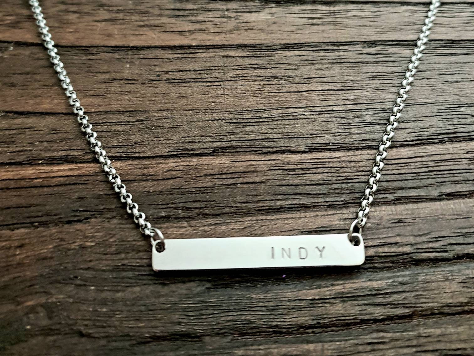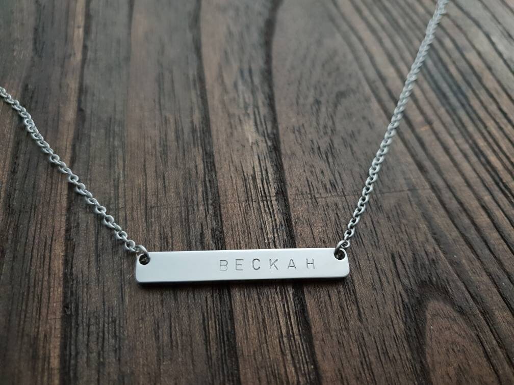 Personalised Name Bar Necklace.Made with stainless steel and hand stamped with any name or Initials.Colour: Silver, Gold or Rose GoldBar size: 40mm length x 6mm wide