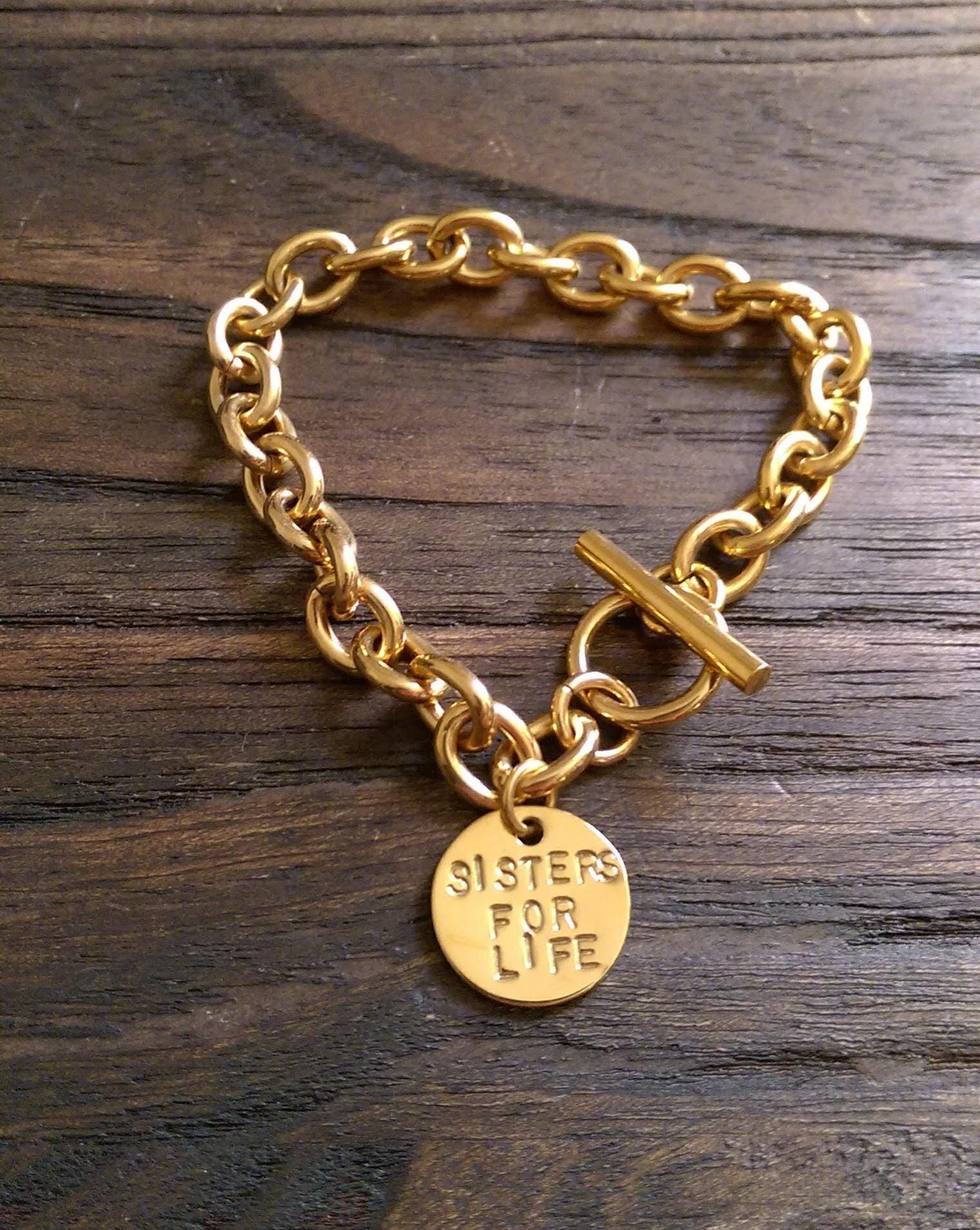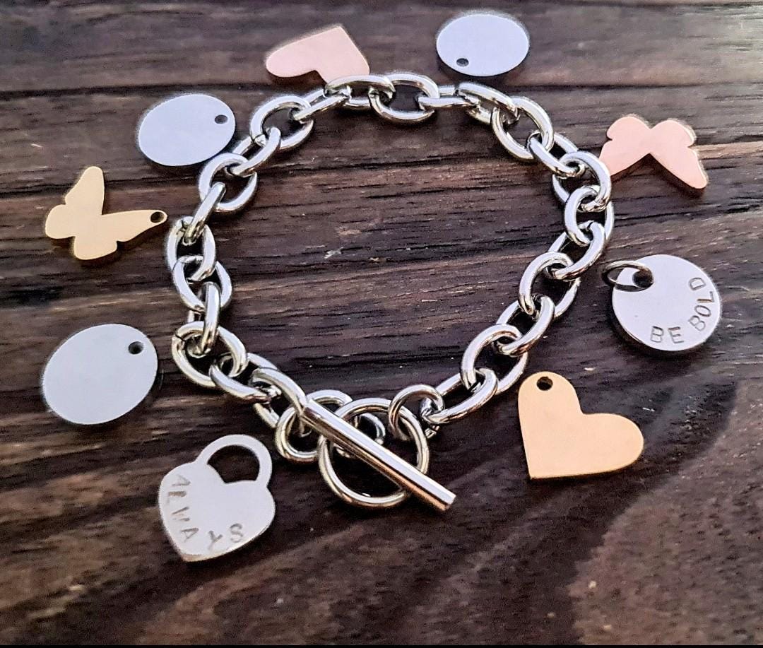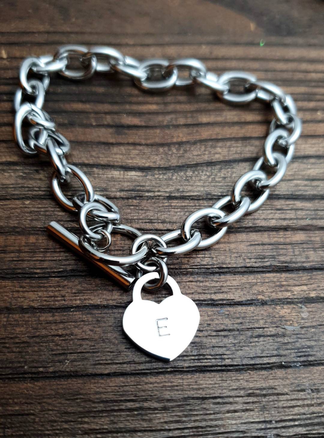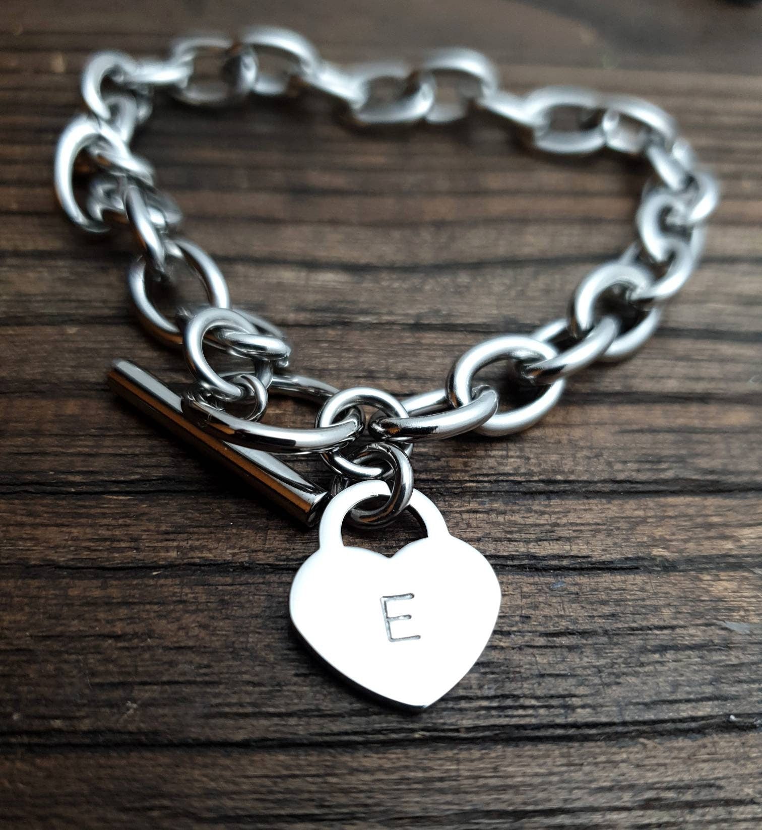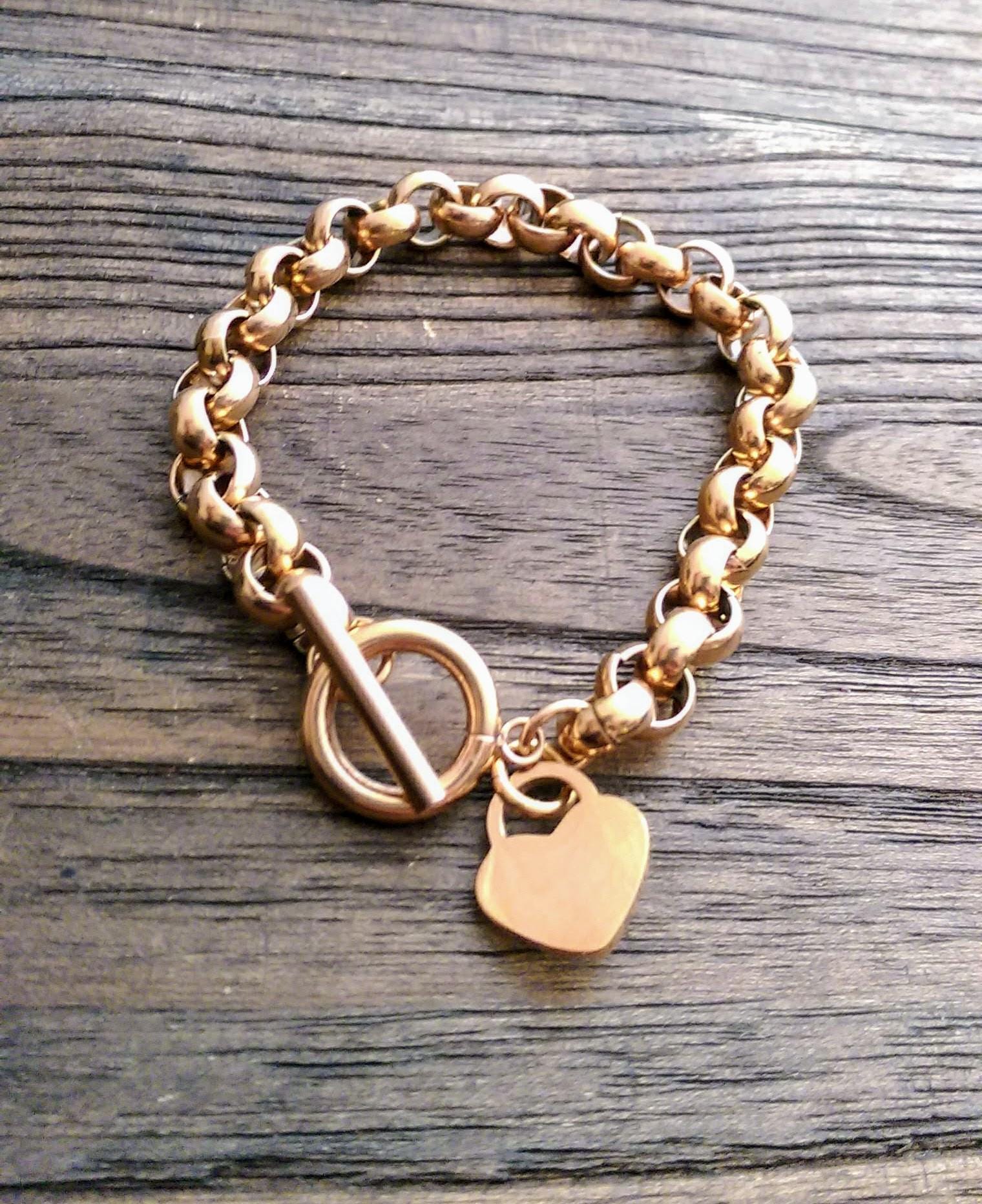 Beautiful 2mm Toggle Bracelet with 15mm Lock Heart which will be hand Stamped with the Initials or Name you prefer. Lovely Mothers Day Present, Valentine's, Birthday Present keepsake. Toggle Bracelet is 21cm in length. Each link is 10mm x 8.5mm with a thickness of 2mm. Made from 316 Stainless Steel. Choose Colour: Silver, Gold or Rose Gold. Stainless Steel is hypo allergenic, it does not rust, change colour or tarnish. It is also durable making it great for crafted jewellery items. Lock Heart measures 15mm x 17mm and is 1.5mm thick. Lock Hearts are made from high quality 316 Stainless Steel. Each Lock Heart comes in a shiny mirror finish. Choose Colour: Silver, Gold or Rose Gold. As soon as your payment clears and I have your email message of what you want engraved, your item will be made and engraved and posted out 3 - 5 days, will email you straight away if there is any delay. If you have any questions please do not hesitate to contact me.