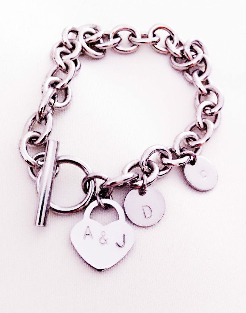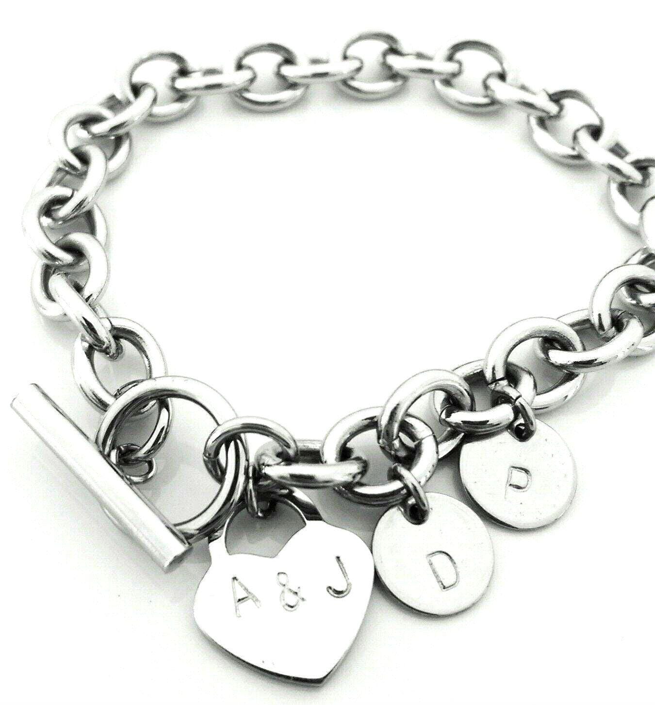Popular Toggle Bracelet Personalised Heart Charm. Hand Stamped Family Initials