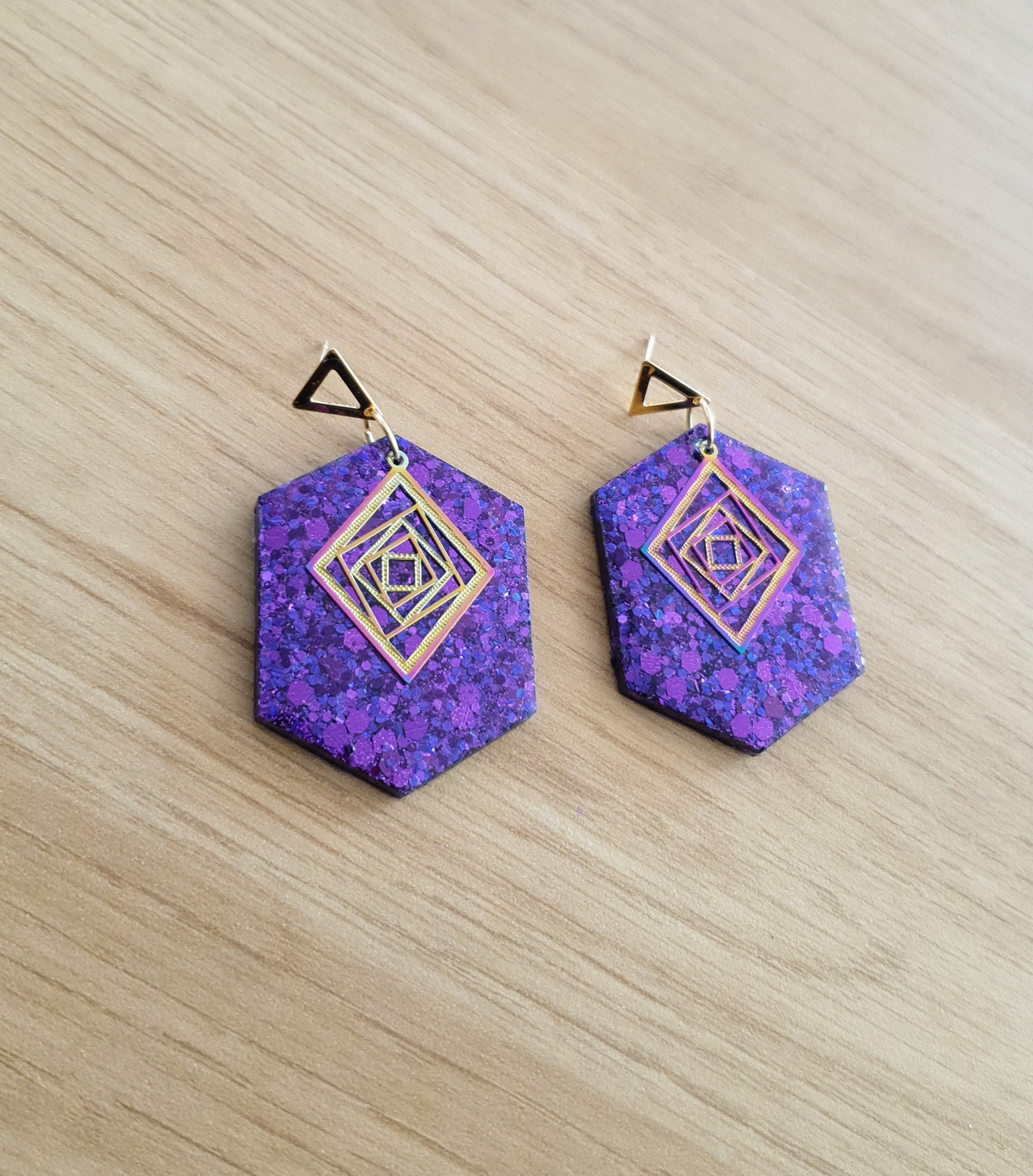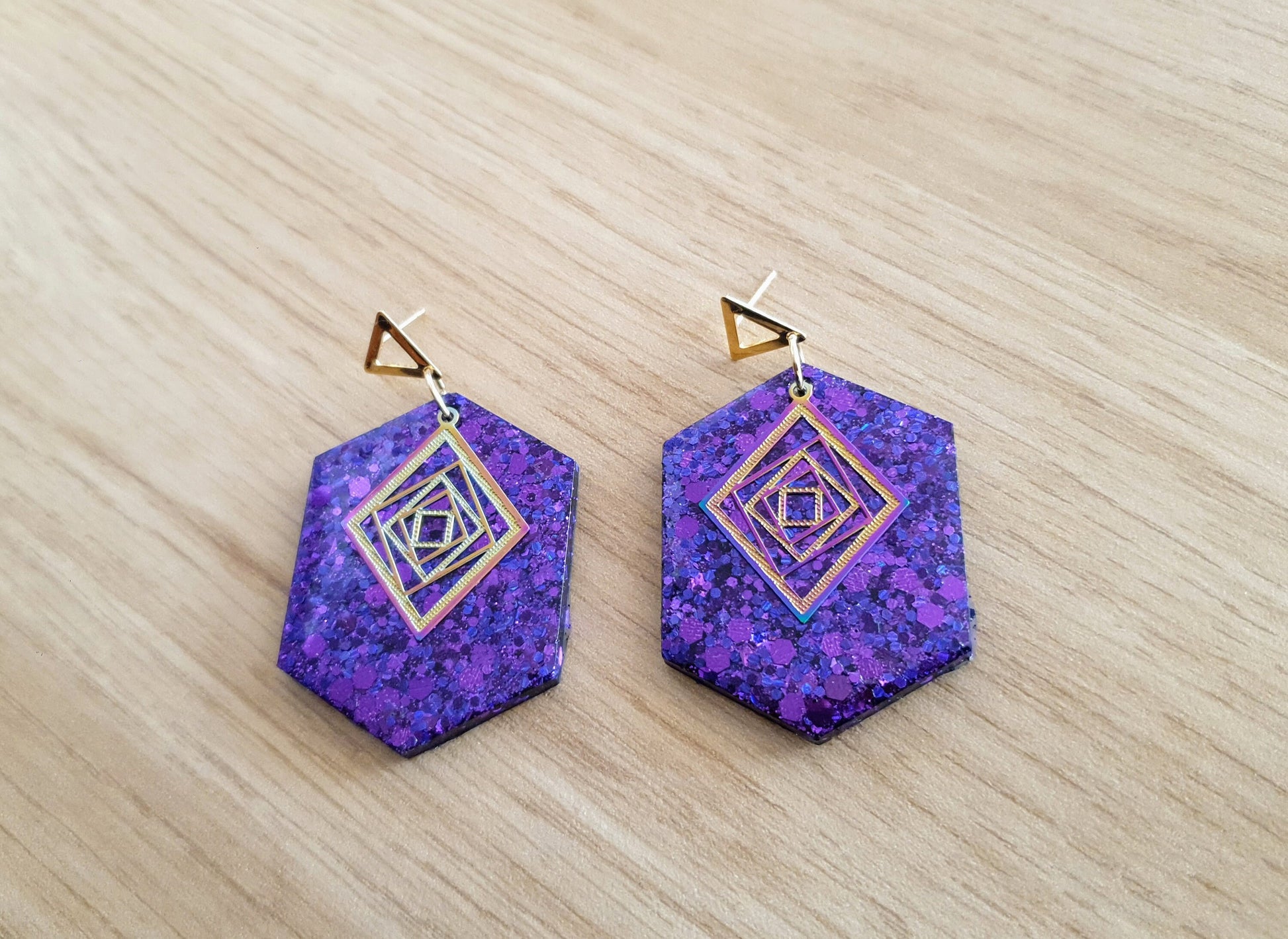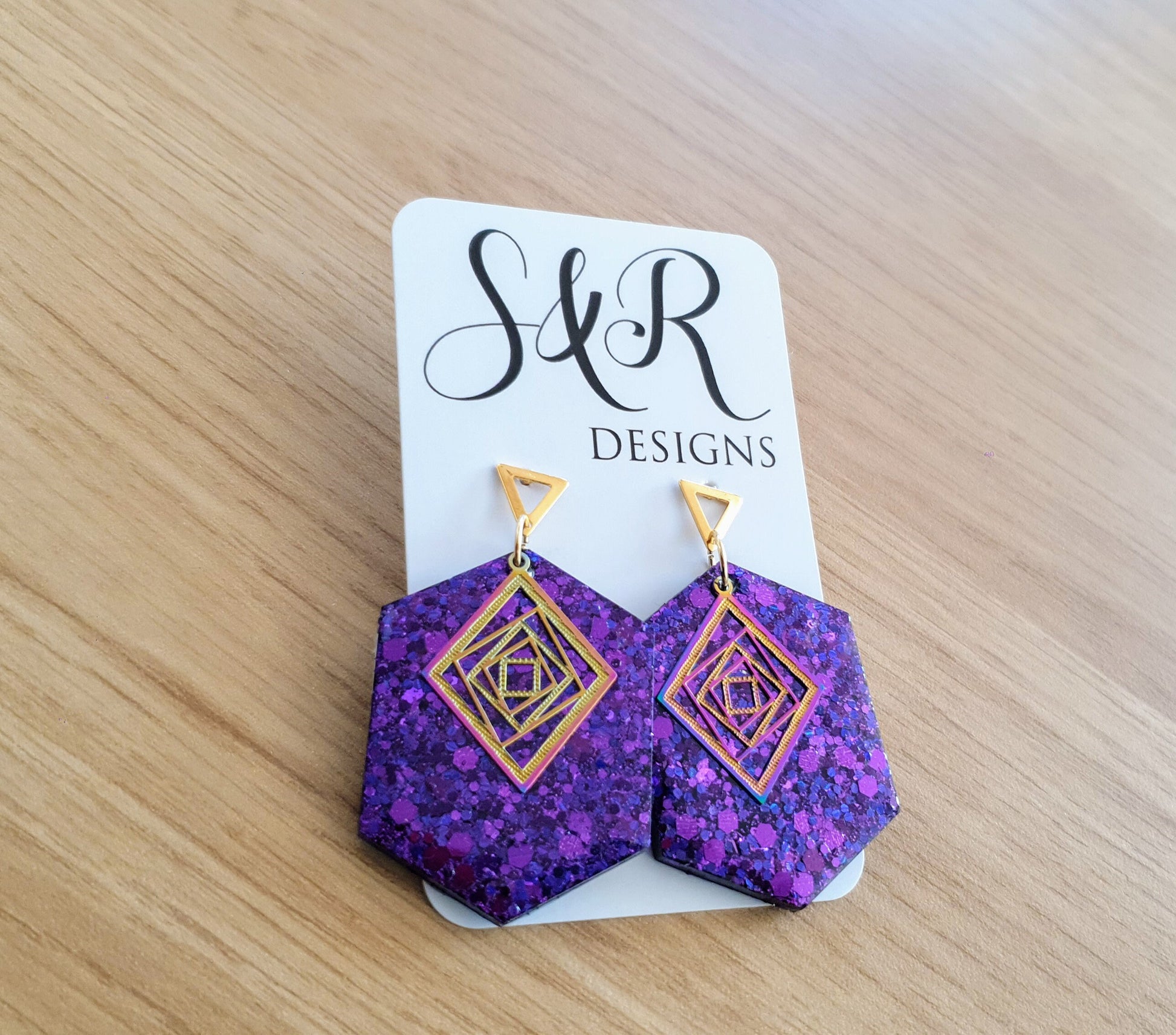 Purple Hexagon with Gold Triangle Dangle Drop Earrings, Resin Handmade with Gold Stainless Steel Stud Earrings, Statement Earrings, Gift