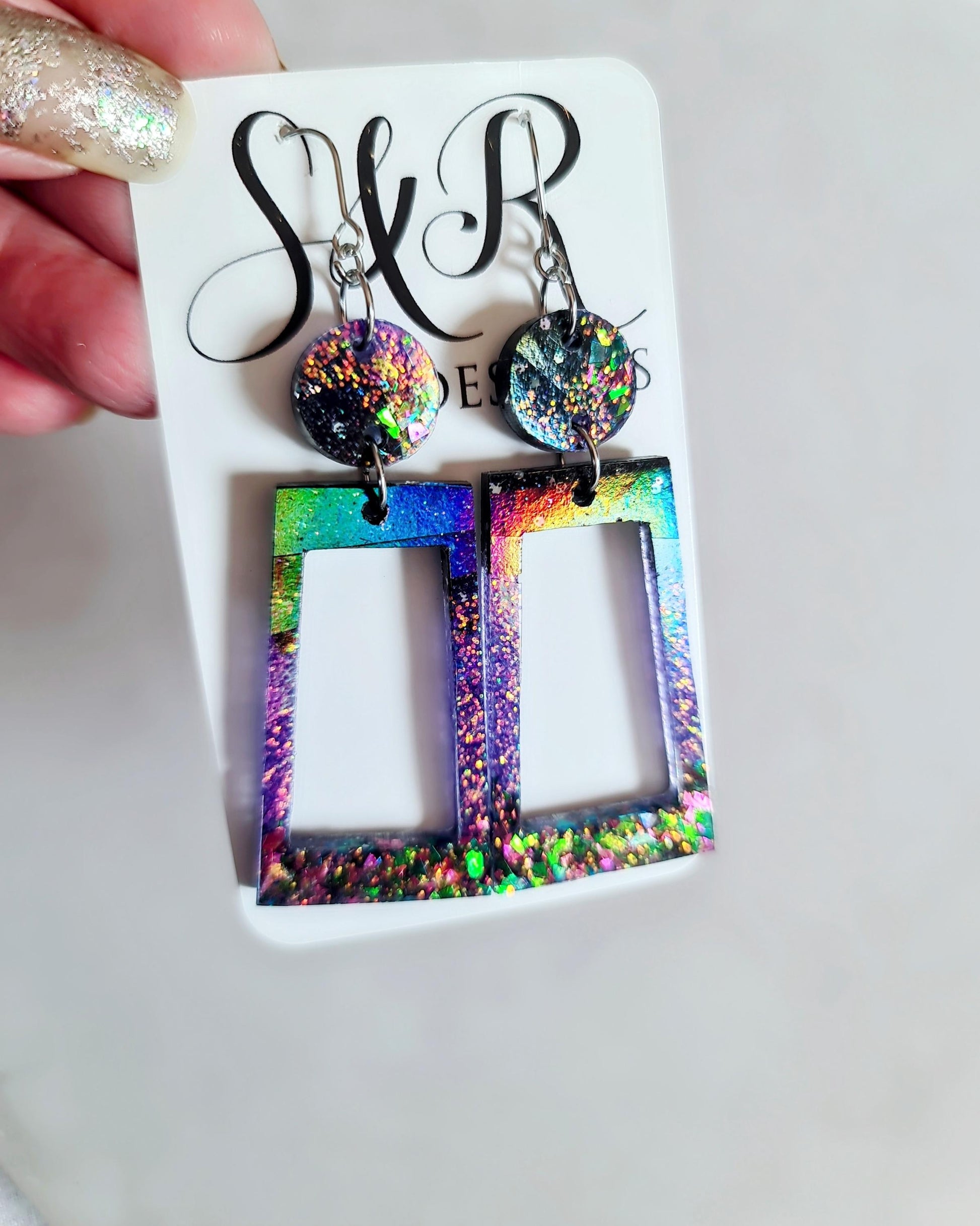 Statement Multicoloured Purple Rectangle Dangle Earwire Hook Earrings. Get noticed with these beautiful sparkly earrings, as you move the reflective colours change simply stunning. Material: Stainless steel, resin, glitter Colour: Purple and Multicoloured Glitter mix Size: 86mm length drop X 26mm wideIf you like light weight comfortable earrings then these are for you. Sparkly you can wear everyday or a night out.All metals are made with stainless steel which is perfect for sensitive ears and never changes colour.