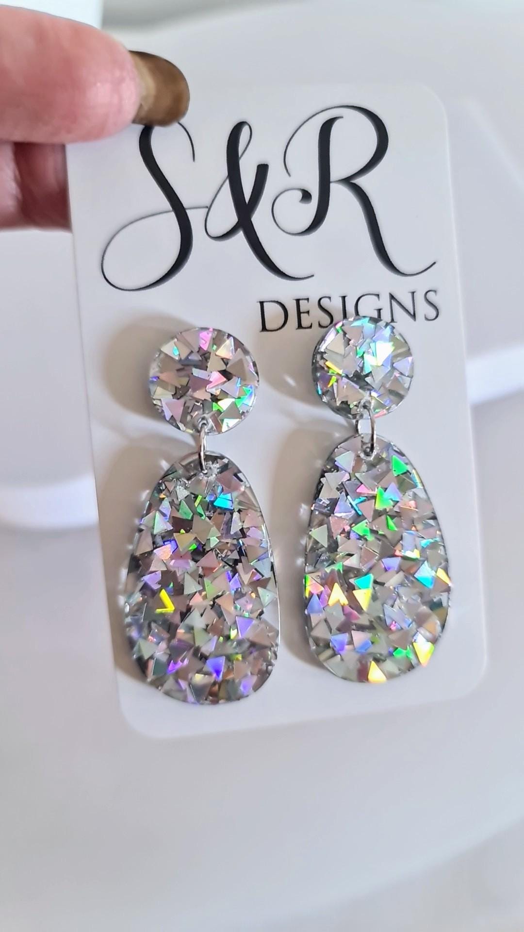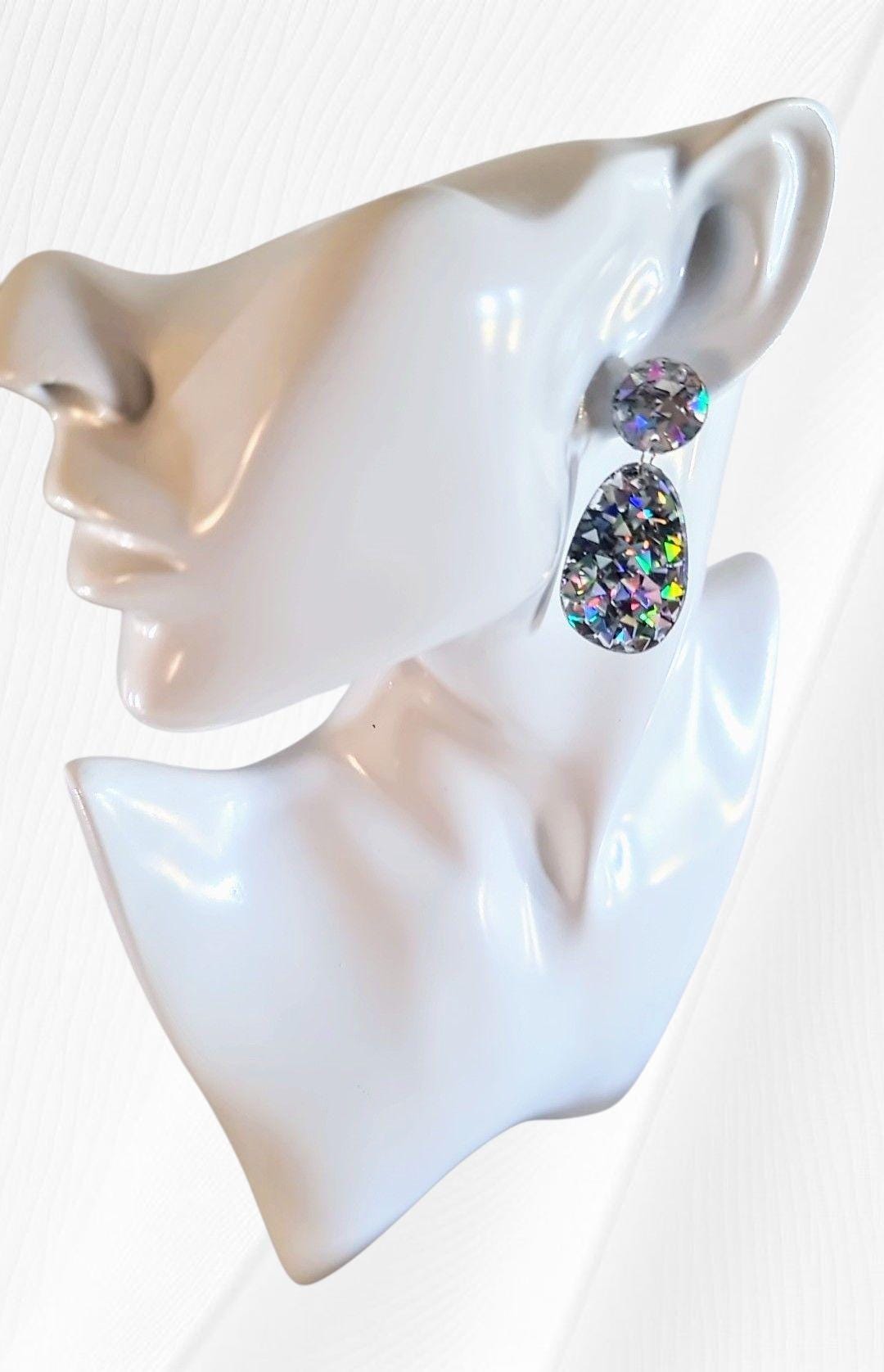Silver Holographic Triangle Glitter Oval Organic Shape Drop Dangle Earrings.Material: Stainless steel, poured resin, glitters.Colour: silver holographic glitter Size: 70mm length drop X 22 mm wide.All resin is mixed and poured, sanded and polished and made by me Angie. If you would like different colours please email me.