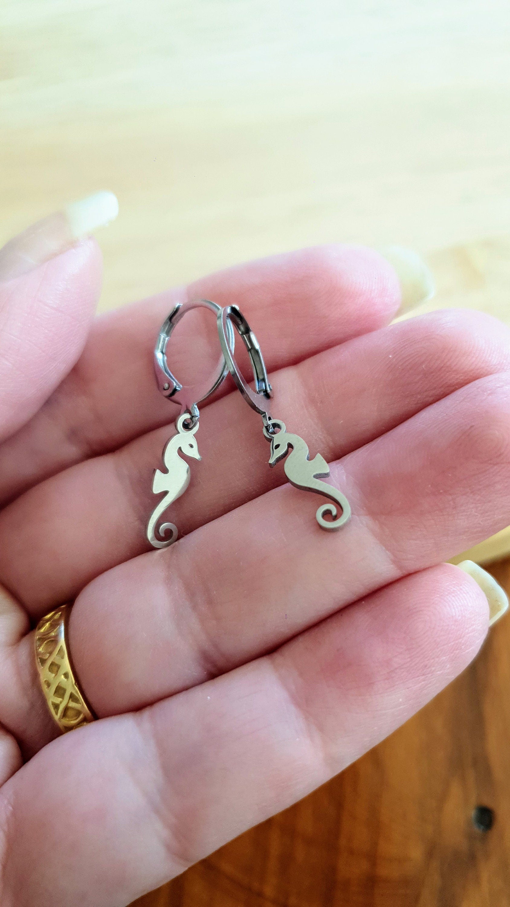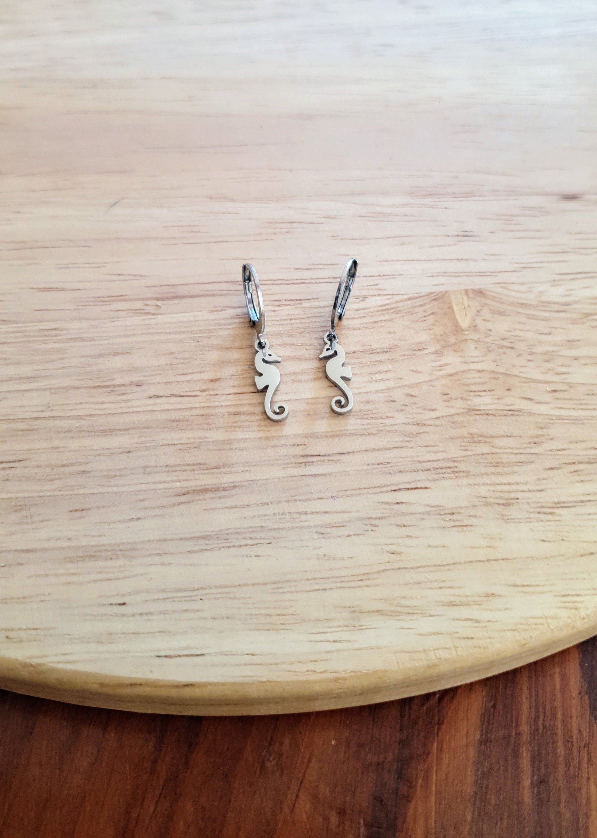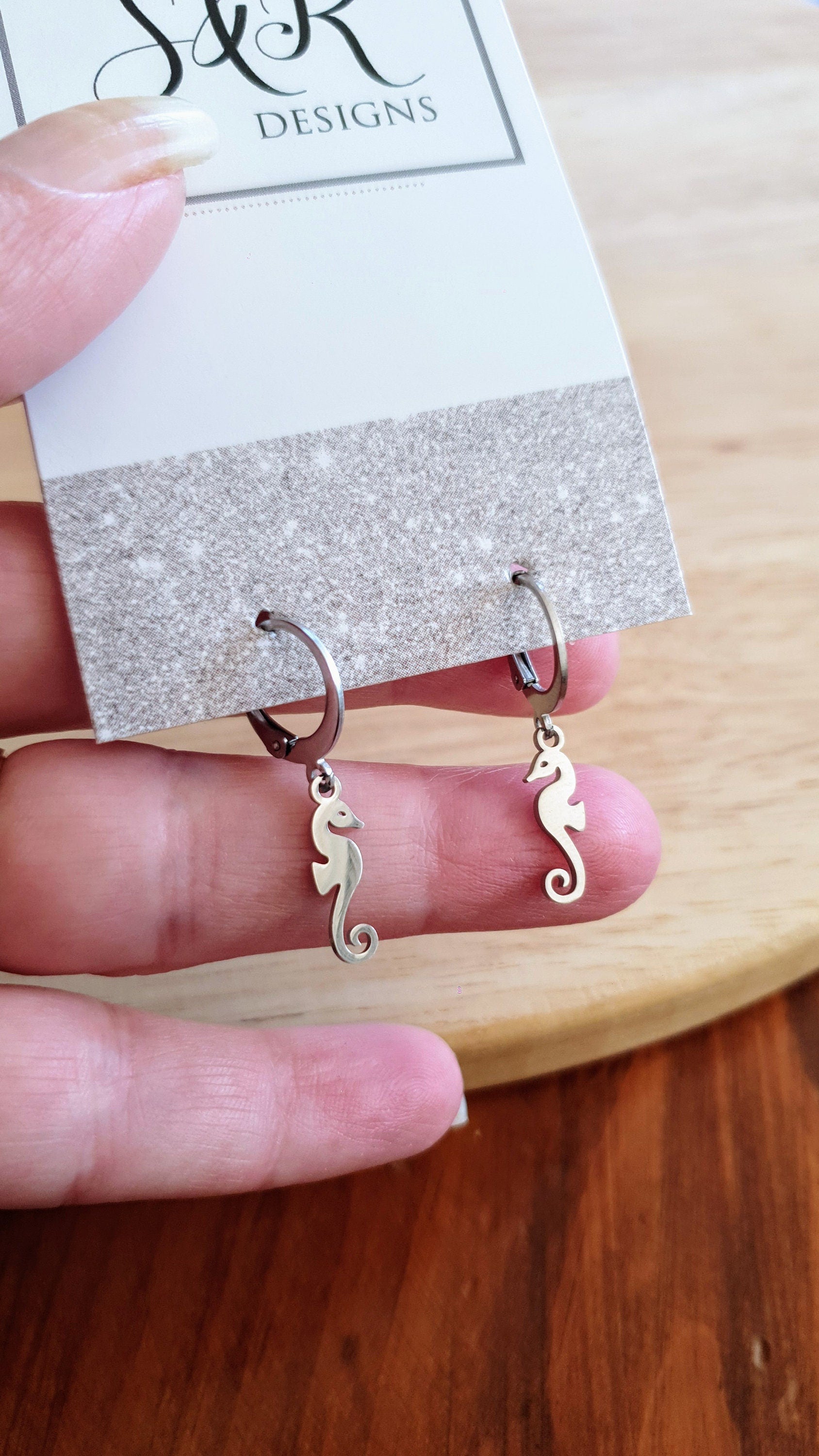 Silver Seahorse Earrings, Minimalist Stainless Steel Dangle Drops, Choose Leverback or Hook Earwire Earrings. Beach Wear Gift