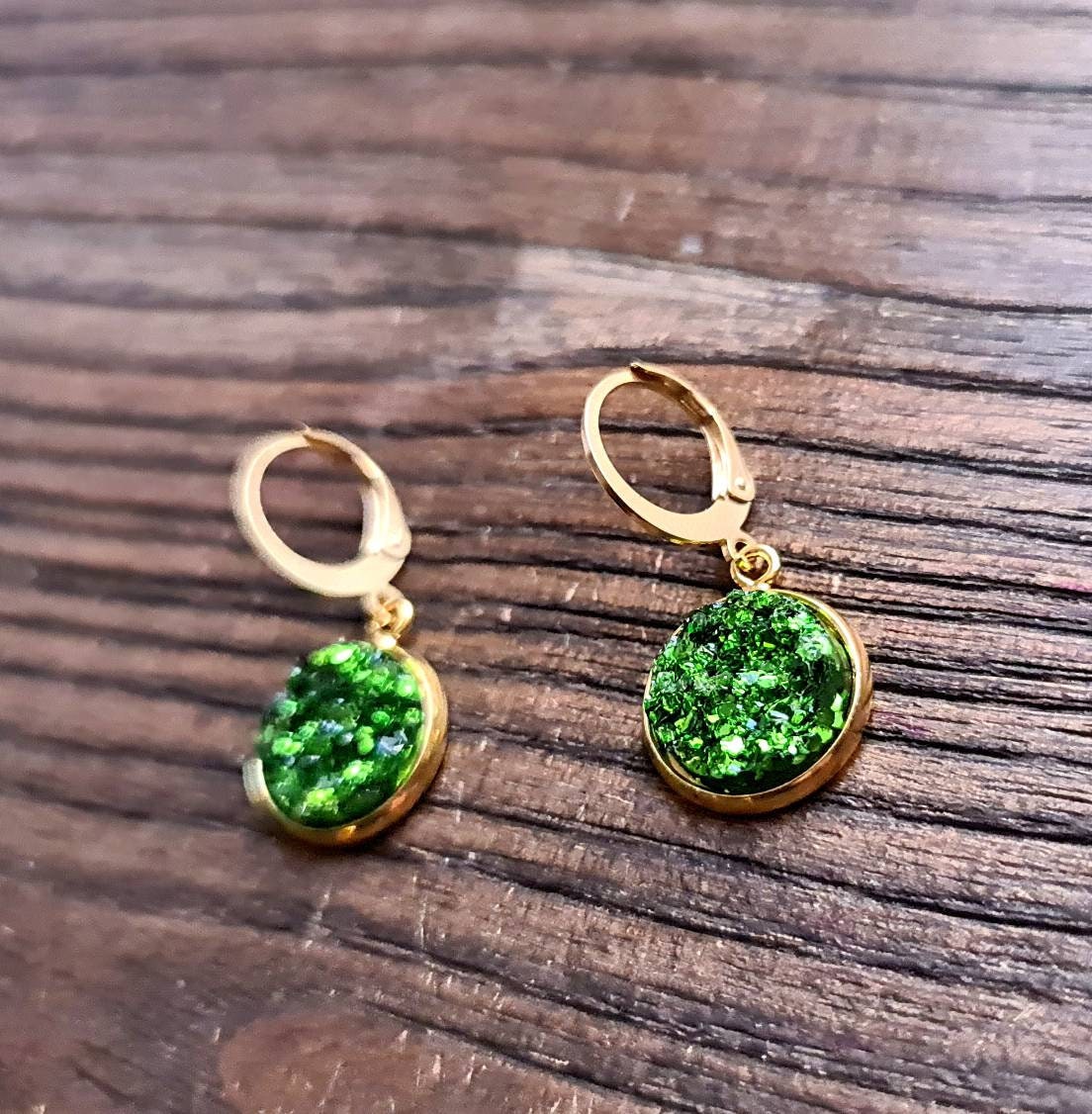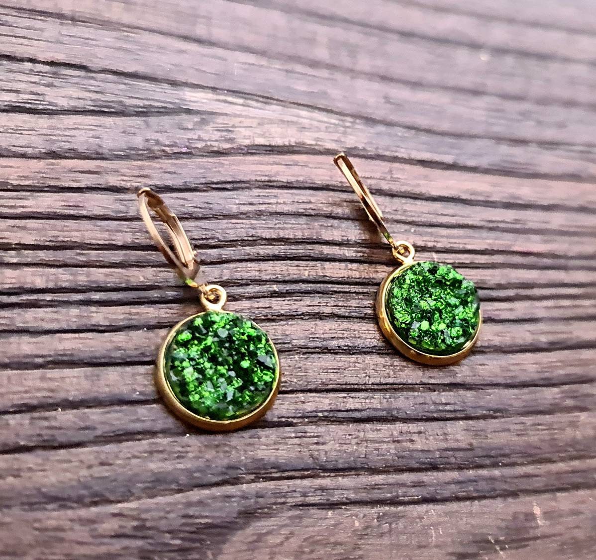 Sparkly Faux Green Druzy Gold Leverback Earrings, made of Stainless Steel 12mm