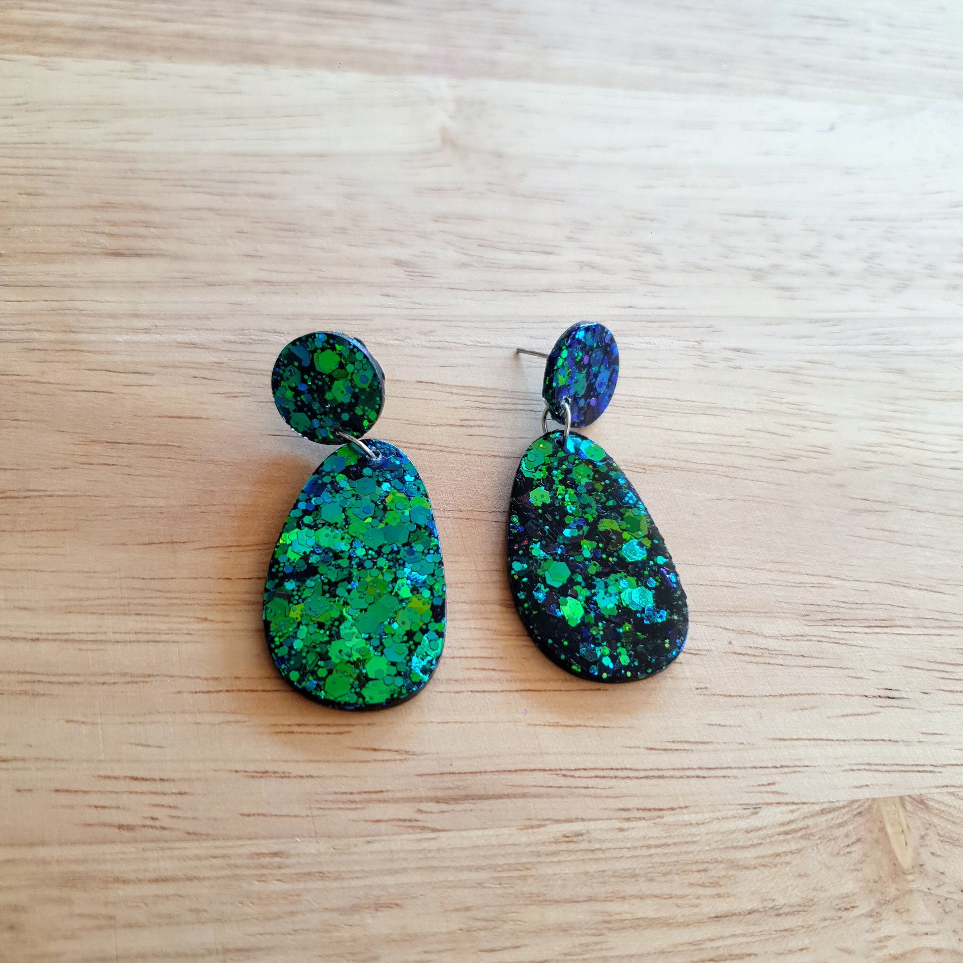 Statement Oval Organic Shape Drop Earrings, Green Blue Changing Glitter, Resin Handmade, Stainless Steel. Personalised Gift Custom Colours