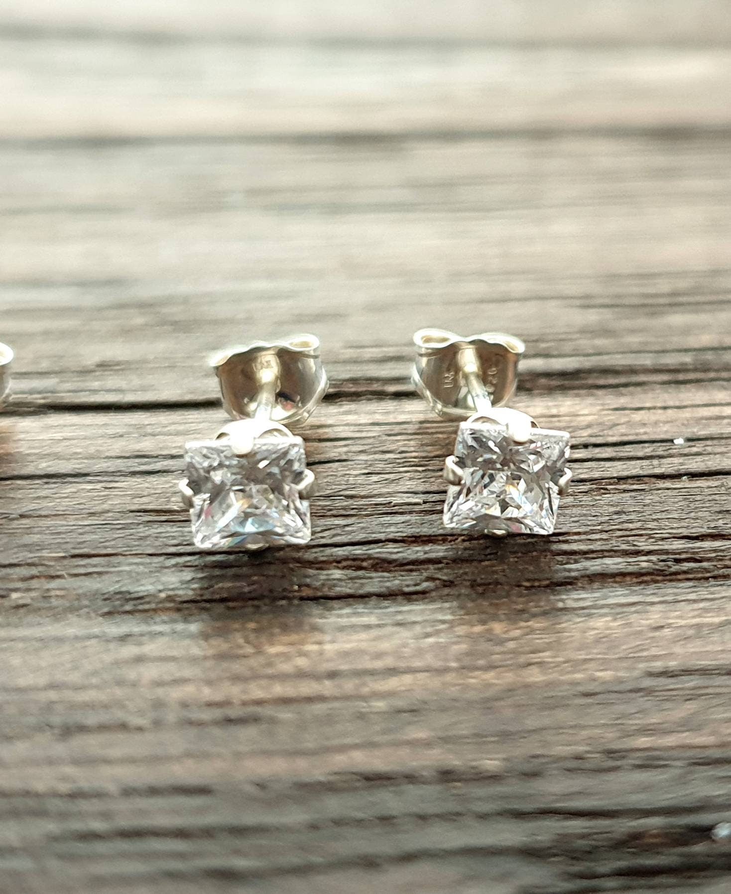 Beautiful sparkly princess cut cubic zirconia AAA hand selected and placed carefully in sterling silver claws with sterling silver butterfly backings.Both posts and butterfly backings are stamped with 925.Size: 3mm, 4mm, 5mm, 6mm, 7mm, 8mm, 9mmColour: Clear