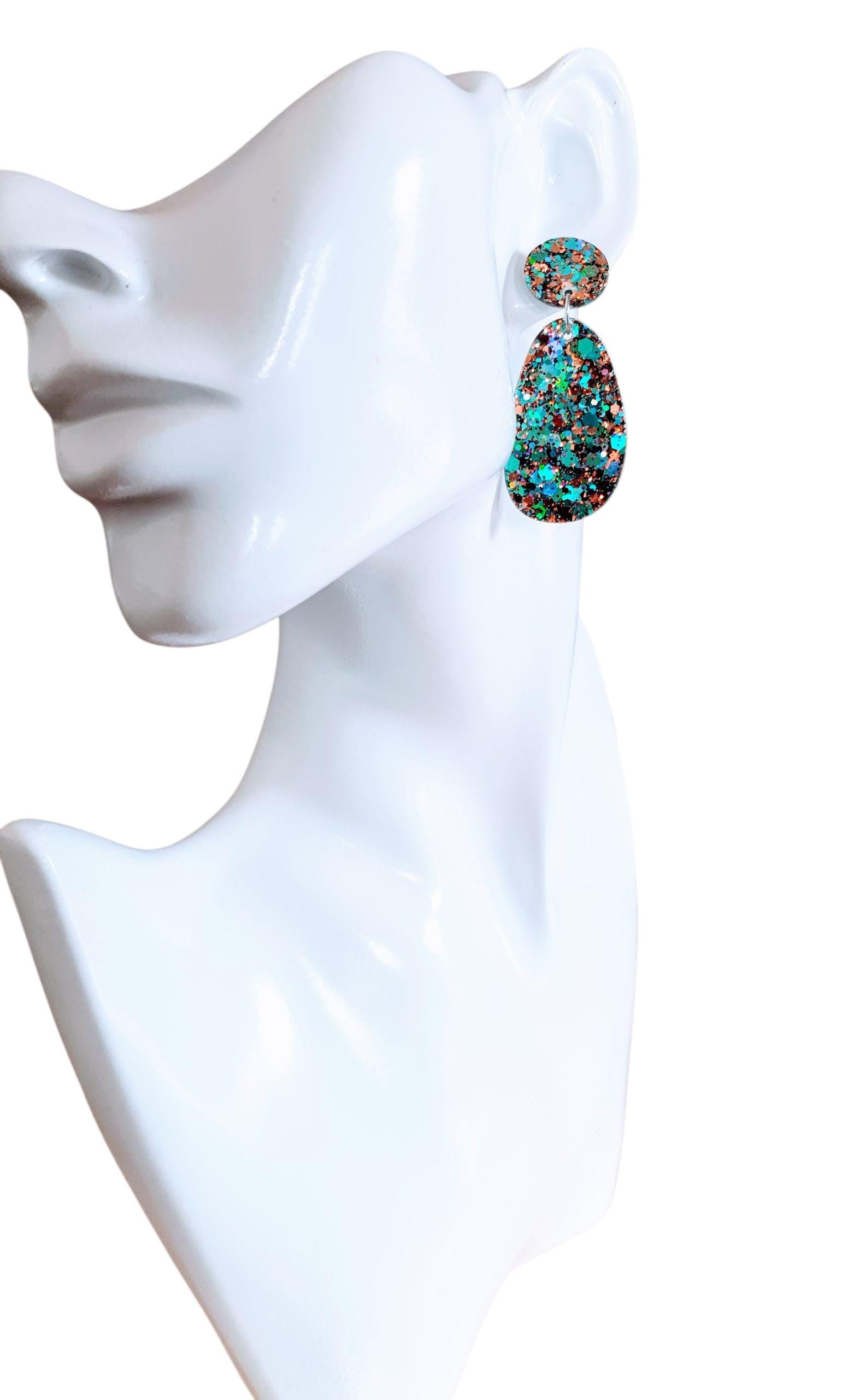 Rosegold & Teal Mix Metalic Glitter Oval Organic Shape Drop Dangle Earrings.Material: Stainless steel, poured resin, glitters.Colour: teal, Rosegold Size: 51mm length drop X 22 mm wide.All resin is mixed and poured, sanded and polished and made by me Angie. If you would like different colours please email me.