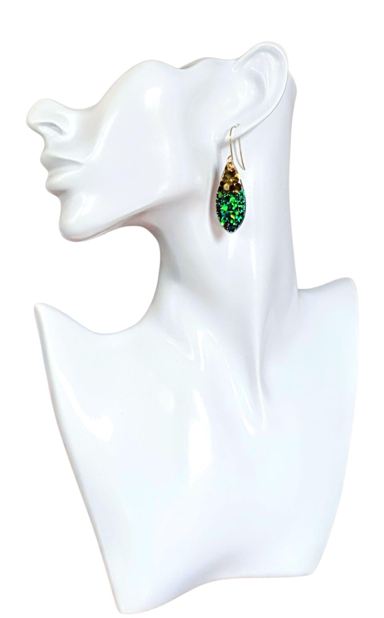 Teardrop Hook Earwire Dangle Gold Earrings, Emerald Green to Blue Chainging Colours eith Gold Glitter, Stainless Steel Statement Earrings.