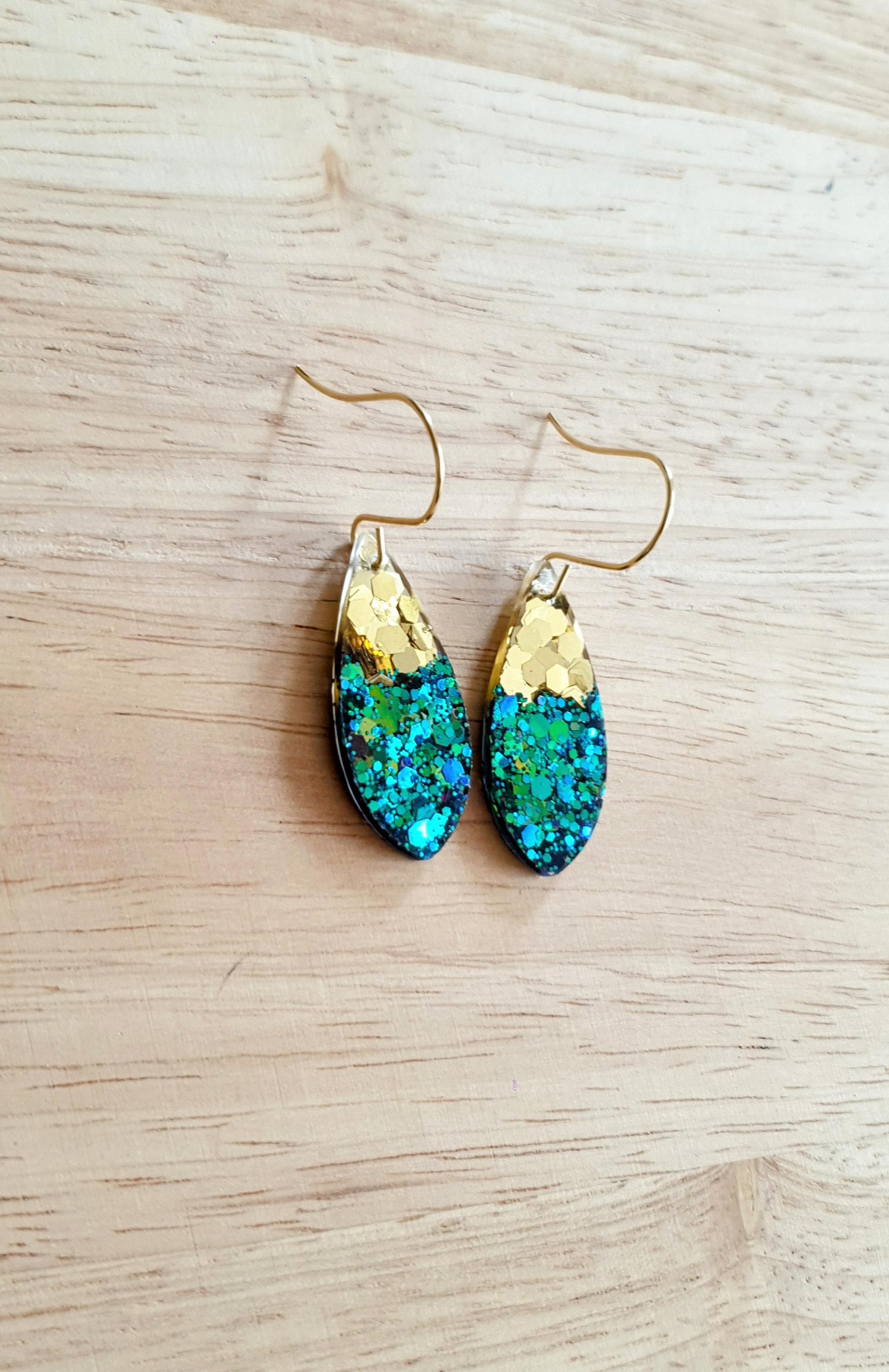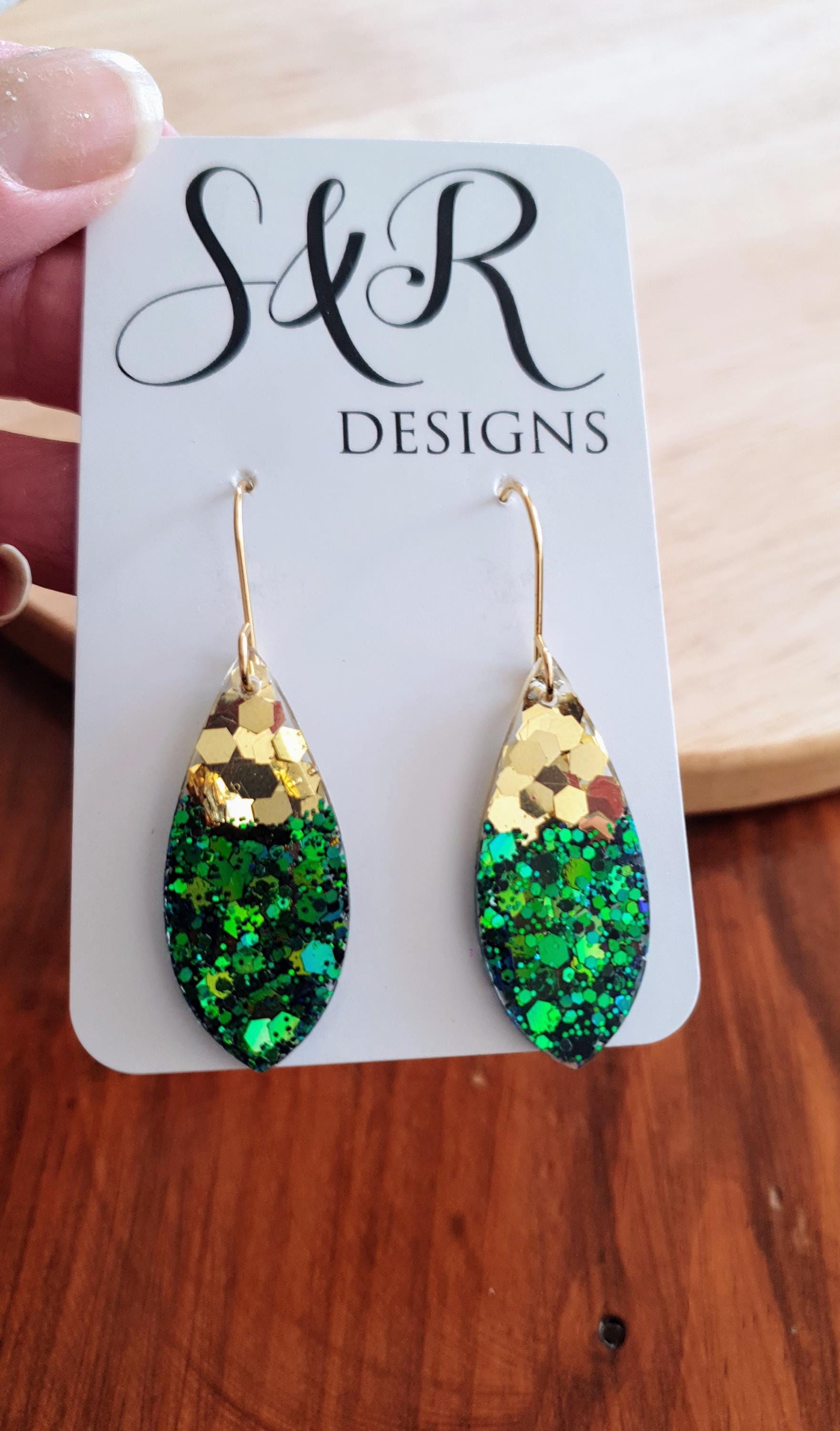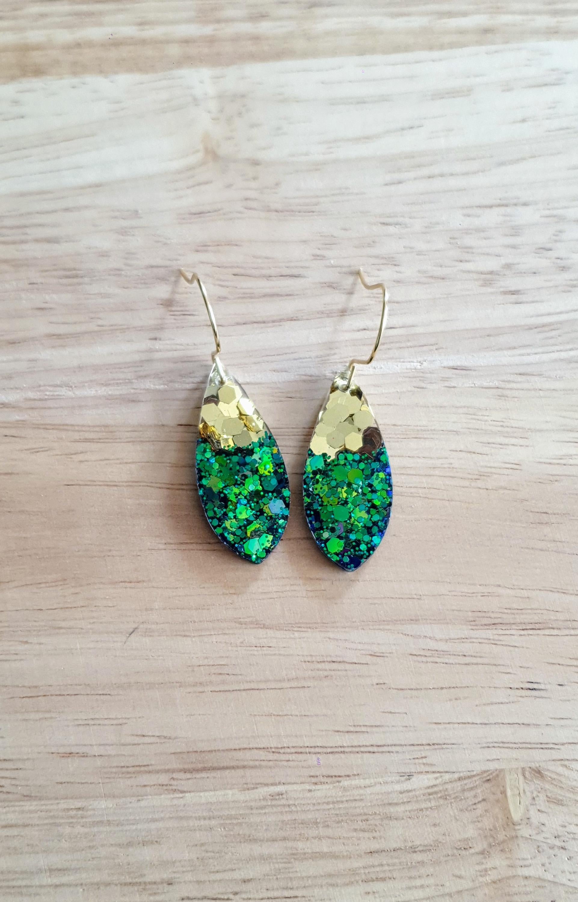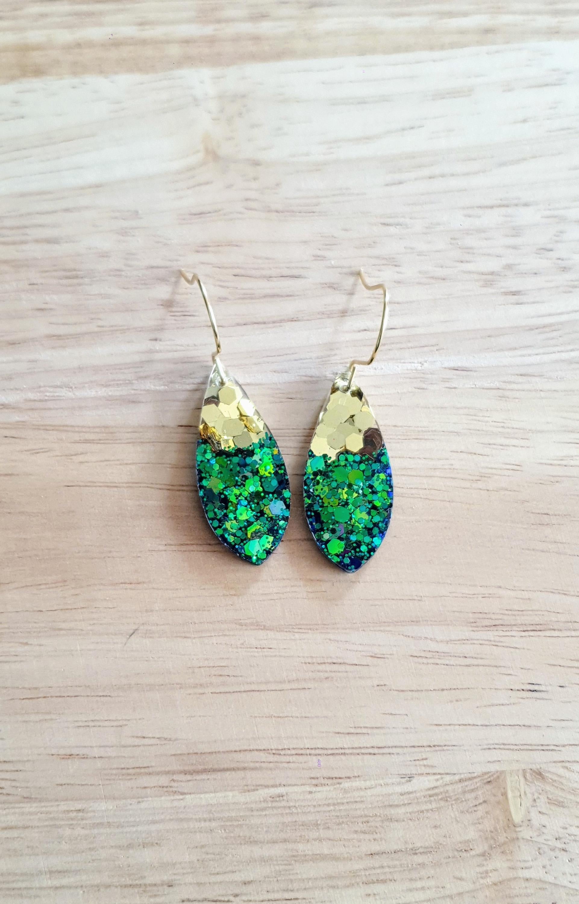 Statement Teardrop Stud Resin Earrings Material: Stainless steel, resin, glitterColour: Emerald green and goldSize: 60m length drop X 15mm wideIf you like light weight comfortable earrings then these are for you. Sparkly you can wear everyday or a night out.All metals are made with stainless steel which is perfect for sensitive ears and never changes colour.