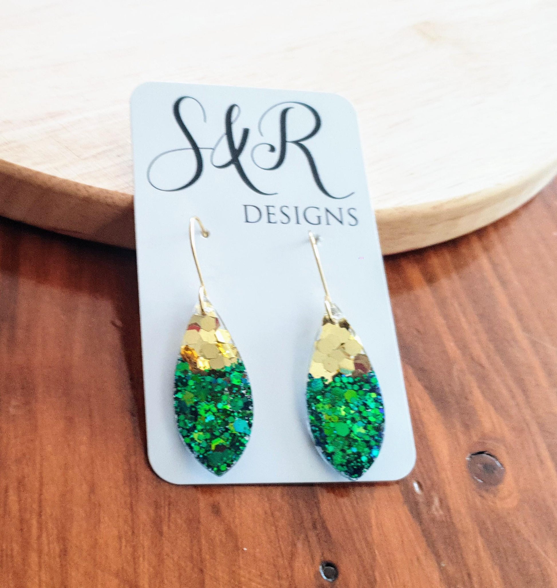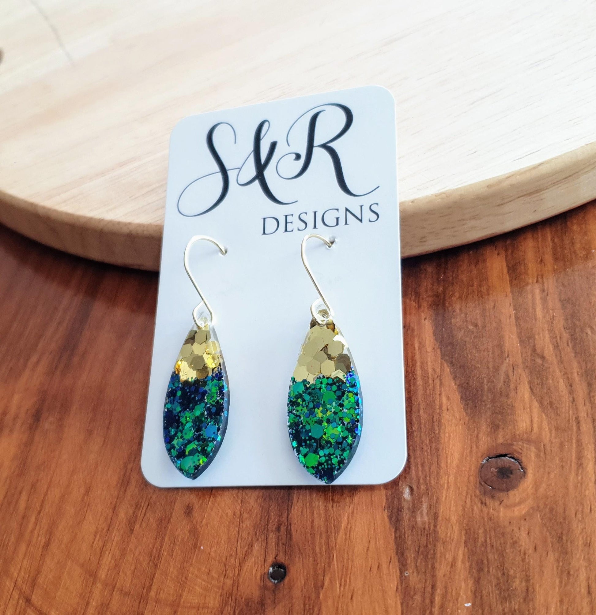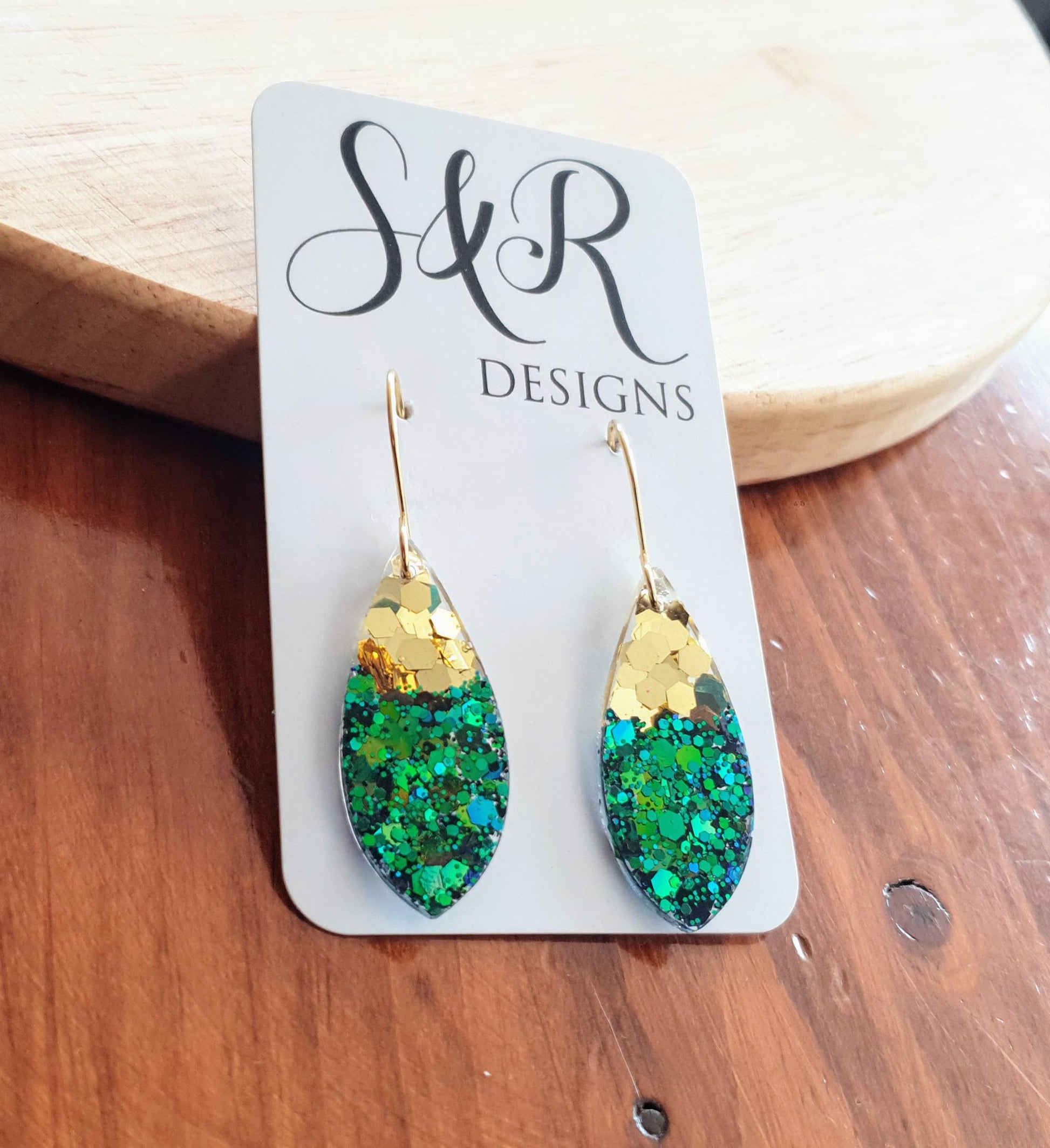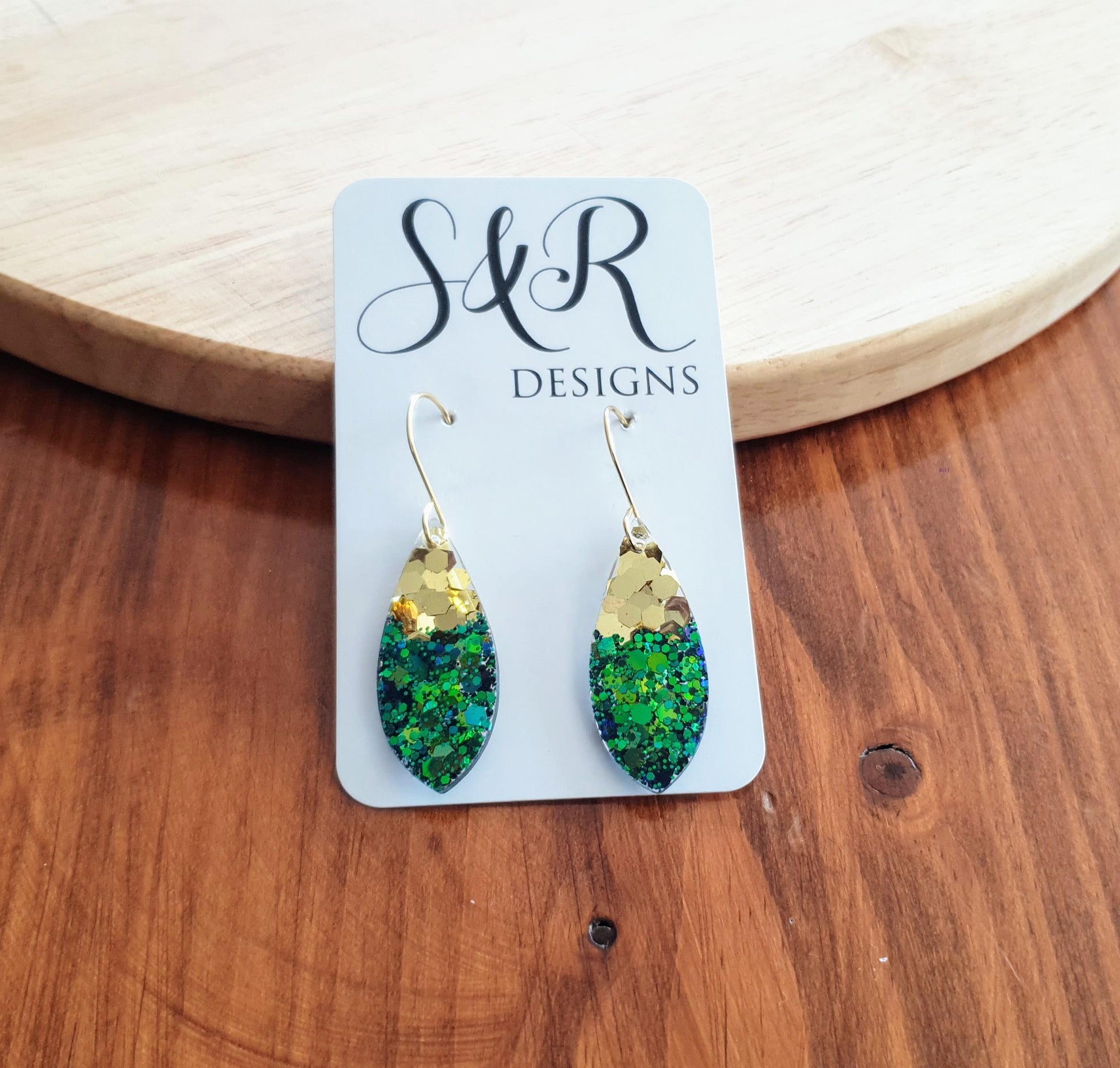 Statement Teardrop Stud Resin Earrings Material: Stainless steel, resin, glitterColour: Emerald green and goldSize: 60m length drop X 15mm wideIf you like light weight comfortable earrings then these are for you. Sparkly you can wear everyday or a night out.All metals are made with stainless steel which is perfect for sensitive ears and never changes colour.