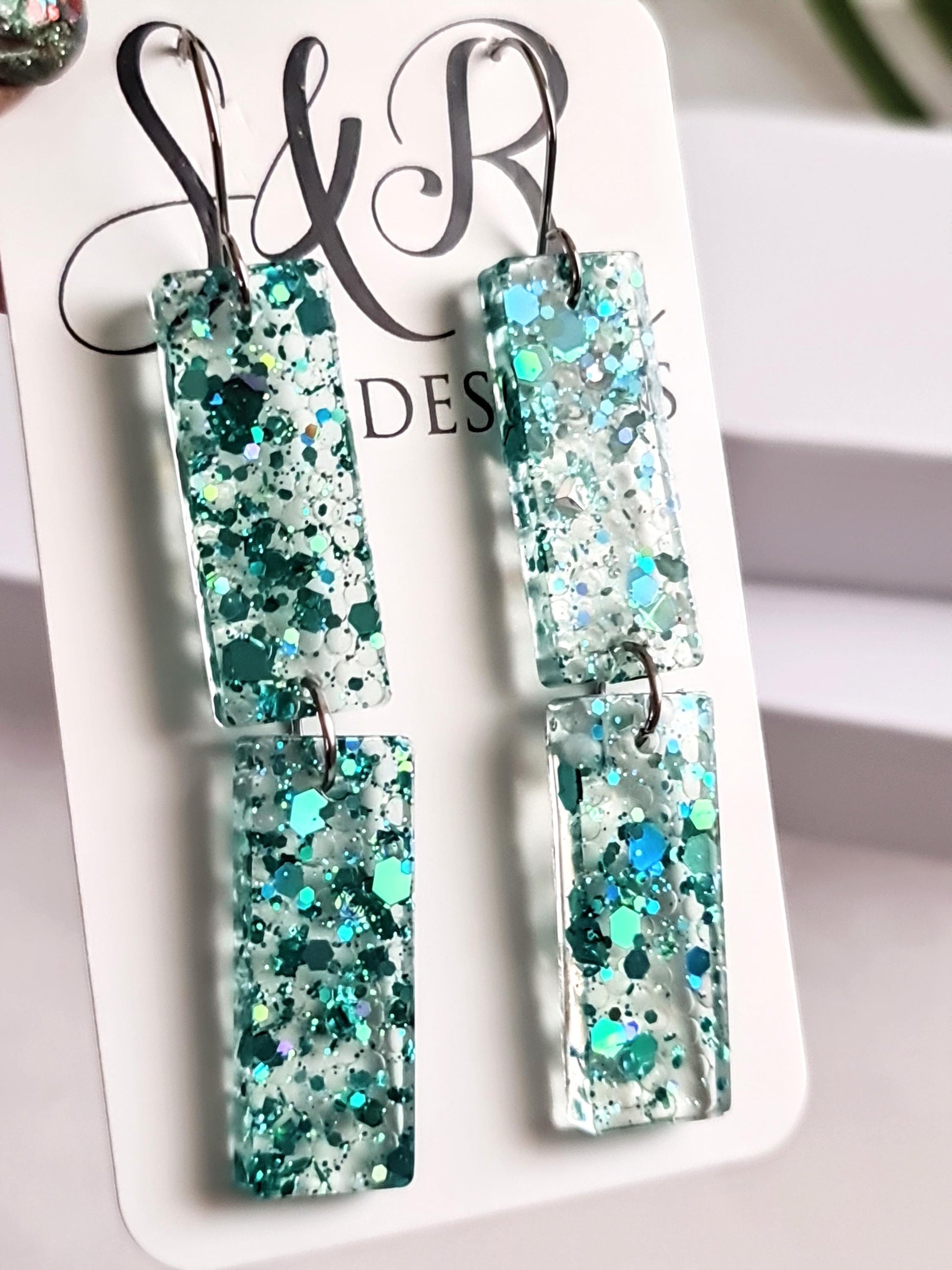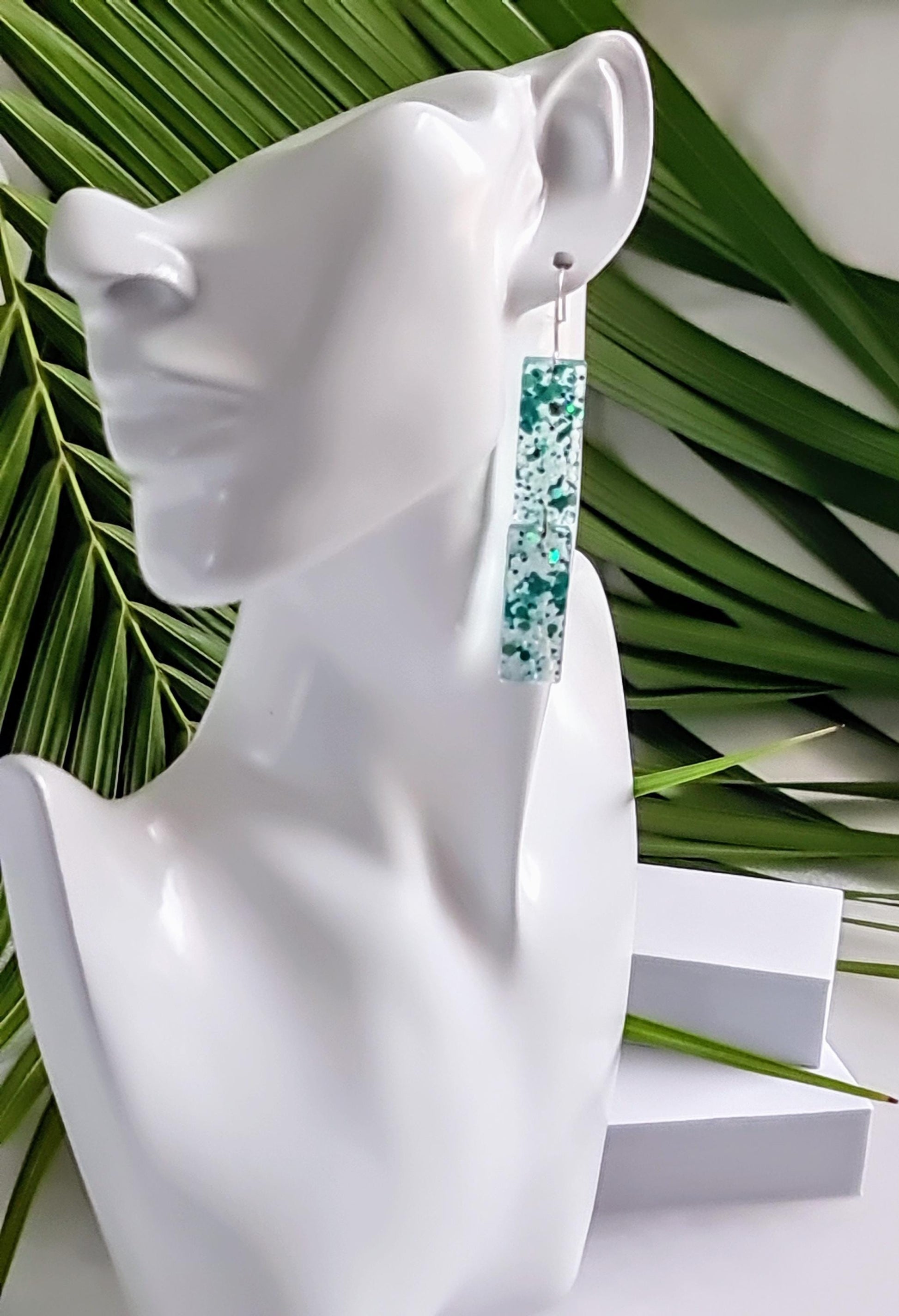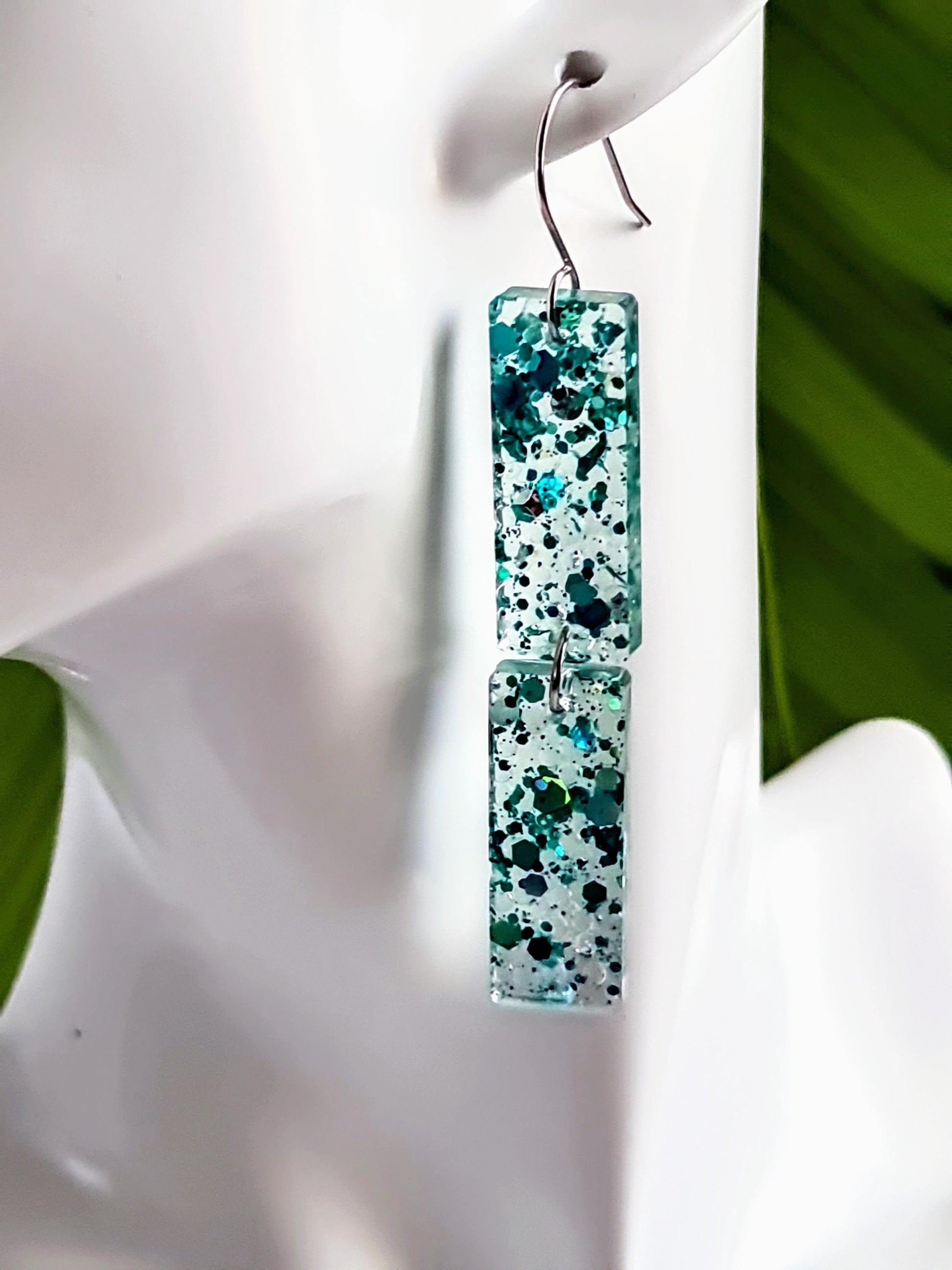 Handmade with high-quality resin and shimmering confetti accents with clear crystal balls, these lightweight bar earrings catch the light beautifully, making them the perfect statement accessory. Whether you're dressing up for a night out, a wedding, or just want to add a little glam to your day, these earrings are sure to turn heads.✨ Features:Handmade with premium resin and turquoise holographic glitter flakes and crystal balls Lightweight and comfortable for all-day wearElegant bar design, perfect for any occasionHypoallergenic stainless steel posts and butterfly backings. Makes a great gift for birthdays, bridesmaids, holidays, and more! 🎁 Looking for a special gift? These unique resin earrings come beautifully packaged, ready for gifting!📏 Size: 80mm length X 12mm wide 📦 Processing Time: 1 - 2 days💖 Love these? Click “Add to Cart” now and make them yours!