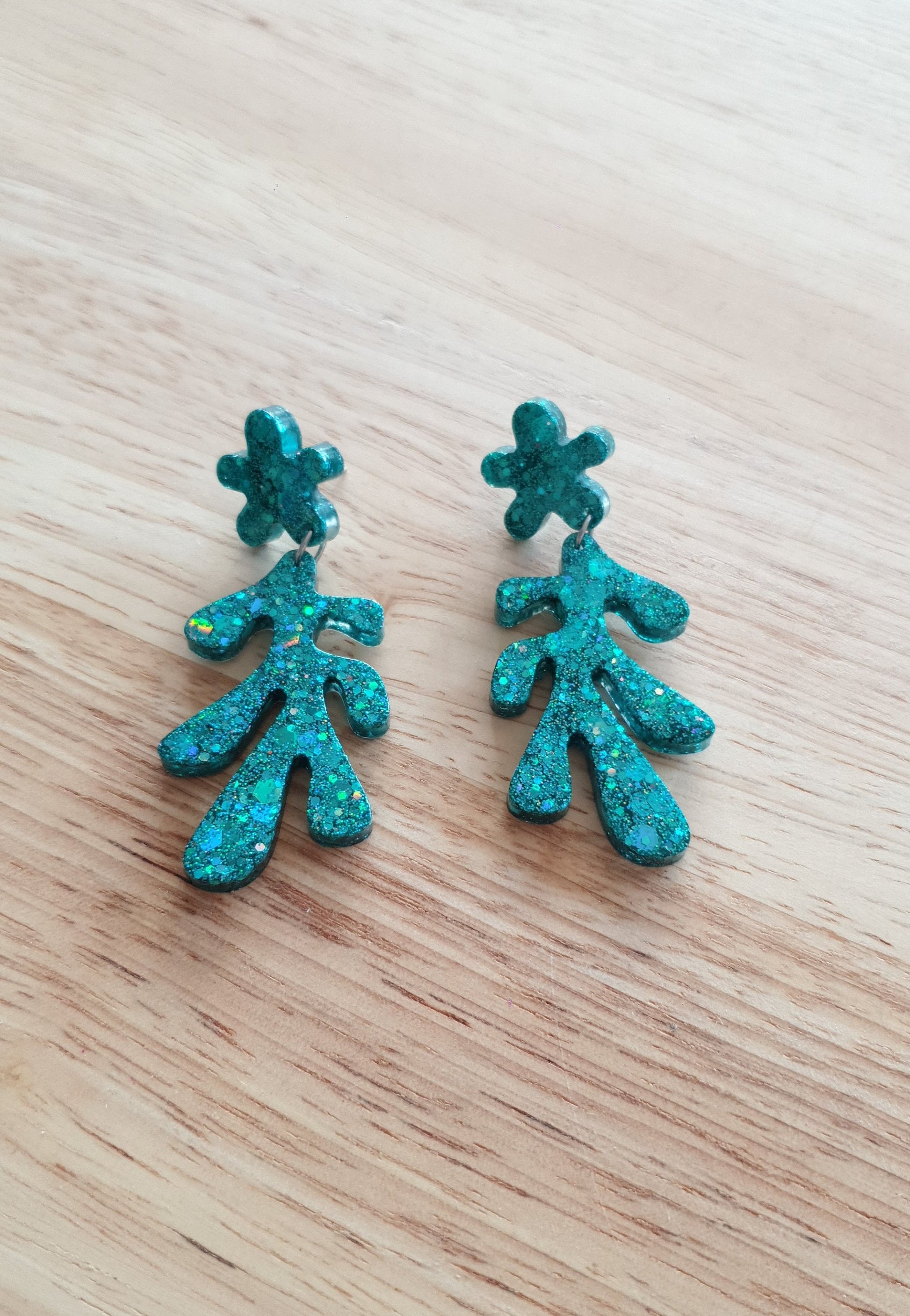 Turquoise Flower Leaves Dangle Drop Earrings, Turquoise Holographic Glitter Resin Dangles, Statement Earrings Stainless Steel